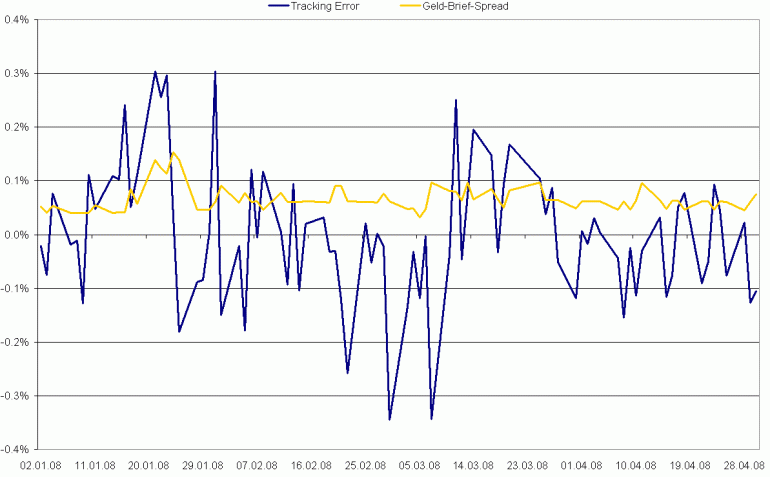 Zunächst hatte ich den Tracking Error im Verdacht. Ich vermutete, dass ich am ersten Tag den ETF zu einem ungünstigen Kurs bewertet habe. Die Abweichung der Entwicklung vom 30.04. zum 02.05. war aber deutlich größer als der übliche Tracking Error, der so bei maximal 0,3% liegt. Die beigefügte Grafik zeigt den Tracking Error in den erste 4 Monaten des Jahres. Dabei habe ich die täglichen Xetra-Kurse von 17:30 Uhr mit dem DAX-Stand verglichen und die tägliche Abweichung vom mittleren Zusammenhang zwischen beiden Reihen berechnet. Bei der Gelegenheit habe ich mir auch noch den Geld-Brief-Spread angesehen. Der liegt im Schnitt bei knapp 0,1%. Das ist ganz ordentlich, allerdings ist der ishares DAX auch der am meisten gehandelte ETF auf Xetra. Etwas höher lag der Spread im Januar, als es in der Börse ordentlich nach unten ging. Im ungünstigsten Fall zahlt man also bei diesem ETF neben den eigentlichen Transaktionskosten einen fiktiven Ausgabe-/Rücknahmeaufschlag von knapp 0,7% (2x maximaler Tracking Error + 1x Spread). Meine Ausgangsfrage beantwortet dies aber nicht.