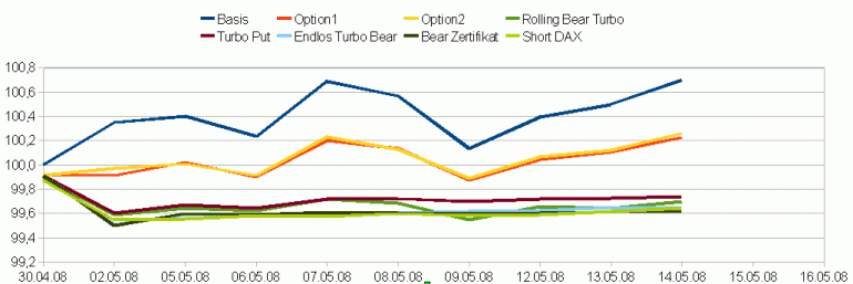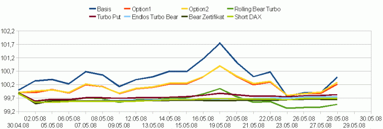 Die etwas bessere Entwicklung des Turbo Put von der DZ-Bank in den ersten zwei Wochen lag wohl eher daran, dass hier die Absicherung nicht 100%ig ist, obwohl dies theoretisch so sein sollte. Mit dem Rückgang des DAX hat er zuletzt einen Großteil seines Vorsprunges verloren. Den Rolling Bear Turbo von GS hat es wie erwartet noch härter getroffen, er ist nun auf dem letzten Platz.