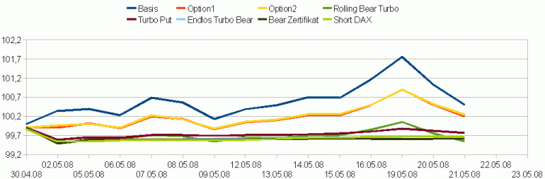 Es ist zudem zu erkennen, dass der Rolling Bear Turbo leicht mit dem Markt schwankt, also die Absicherung tatsächlich nicht mehr 100%ig ist. Bei diesem Produkt wird der Knock-Out und der Bezugspreis täglich neu festgelegt, damit der Hebel konstant bleibt, in diesem Fall bei 10. Für Absicherungszwecke erscheint diese Vorgehensweise weniger geeignet.