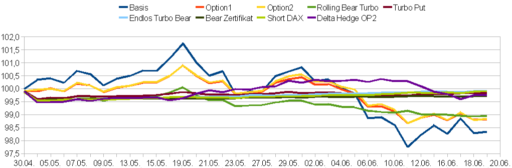 Torman Juni 20, 2008 Der DAX sorgt weiterhin für Spannung, auch wenn die Verluste von heute noch nicht in der Grafik auftauchen. Bei 5XXX Punkten geh ich wieder long. :- Es gibt wieder eine Führungswechsel. Der in der letzten Woche hinzugefügte Delta-Hedge hat wegen des Rückgangs der Vola den ersten Platz abgeben müssen. Mittelfristig hat er gegenüber den Zertifikaten und dem ETF einen immanenten Nachteil. Er verliert an Zeitwert und hat keine interne Verzinsung. Die stabilen Zertifikate und der ETF liegen weiterhin sehr nah zusammen. Lediglich das Endlos Bear Zertifikat von HSBC fällt leicht ab. Es ist das Zertifikat mit der höchsten Kapitalbindung und nun zeichnet sich ab, dass es eventuell die schlechteste interne Verzinsung hat. Es kann jedenfalls nicht daran liegen, dass der Geldmarktfonds zu gut performed. Im Depot mit dem Short-ETF fehlt der Geldmarktfonds komplett und trotzdem schlägt sich dieses sehr gut. Diesen Beitrag teilen Link zum Beitrag