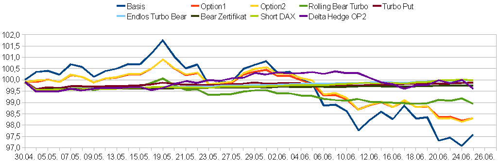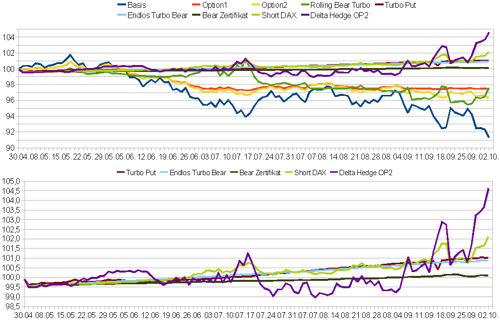 Torman Juli 3, 2008 Der DAX ergründet neue Tiefen und mein Test hat sich vom Timing her als genau richtig erwiesen. Auf Basis der zuletzt gewonnenen Erkenntnisse, lassen sich die Ergebnisse auch etwas besser beurteilen. Inzwischen liegt der Short-ETF allein in Führung, was sich wohl durch die leichte Übersicherung erklären lässt. Danach folgt das Endlos Turbo Bear Zertifikat von der Commerzbank, dass bei den Untersuchungen hinsichtlich Erklärbarkeit des Preises und interne Verzinsung am besten abgeschnitten hatte. Ich würde es deshalb bislang zum eigentlichen Sieger erklären. Aber die Konkurrenz schläft nicht. Der für mich bislang undurchschaubare Rolling Bear Turbo von Goldman Sachs hat gewaltig aufgeholt. Relativ zur Aktienmarktentwicklung reagiert er nahezu täglich anders. Bei der möglichen täglichen Umstellung der Konditionen ist das auch nicht ganz verwunderlich. Aber kann man diese Änderung irgendwie erklären oder vorhersagen? Ich glaube das wird das nächste Projekt. Ich habe bislang aber noch keine Idee, wie ich das angehen soll. Auch der Delta-Hedge mit dem Optionsschein liegt noch recht gut im Rennen. Zum Turbo Put der DZ Bank habe ich noch einen Nachtrag. Der Erklärungsgehalt der Schätzung ließ sich hier durch die Aufnahme des VDAX erhöhen. Überraschenderweise ergibt sich ein signifikanter negativer Einfluss der Volatilität, also genau andersherum als bei Optionsscheinen. Mit 0,84 ist der Erklärungsgehalt der Schätzung aber noch immer ein Stück von den anderen relativ stabilen Portfolios entfernt. Die Preisbildung bei diesem Zertifikat bleibt also rätselhaft. Diesen Beitrag teilen Link zum Beitrag