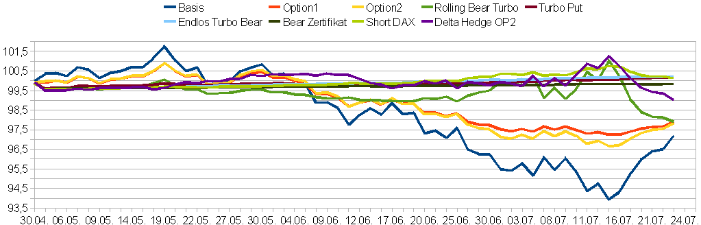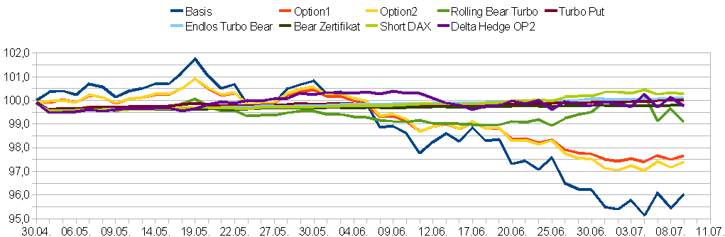 Torman Juli 17, 2008 Nach der Theorie nun wieder etwas Praxis. In der letzten Woche ist der DAX kräftig gefallen. Der Abwärtstrend hat sich also fortgesetzt und davon haben genau die Trendspezialisten Short-DAX-ETF und Rolling Bear Turbo profitiert. Beide Depots sind im Plus, aber ein anderes hat sich noch etwas besser entwickelt. Der Delta-Hedge Optionsschein wurde von der gestiegenen Volatilität an die Spitze getragen. Diesen Beitrag teilen Link zum Beitrag