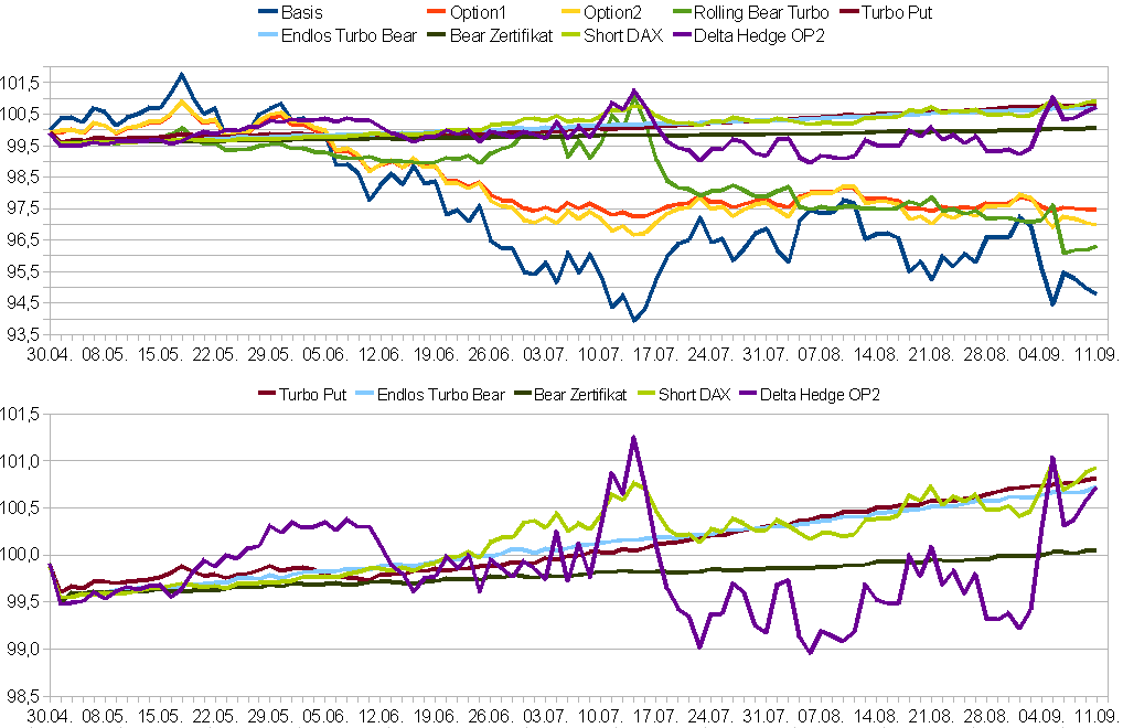Torman September 14, 2008 Nach einem längeren Urlaub gibt es heute wieder an Update von mir. Damit das Treiben in der Spitzengruppe besser sichtbar wird, habe ich eine zusätzliche Grafik mit den ersten fünf Depots hinzugefügt. Durch den Wertverfall beim DAX ist der Short-ETF wieder an die erste Stelle gerückt. Bemerkenswert ist, dass der Turbo Put der DZ Bank seit einem Monat permanent etwas vor dem sehr ähnlichen Zertifikat der Commerzbank liegt, obwohl der DAX wieder kräftig gefallen ist. Die begrenzte Laufzeit des DZ Bank Zertifikats macht sich eventuell doch in einer höheren Rendite bemerkbar. Die Zeit wird zeigen, ob es so weitergeht. Der Delta-Hedge mit dem Optionsschein weist seit einiger Zeit eine Übersicherung aus. Durch den Zeitwertverlust und die Bewegung weit ins Geld ist das Delta des Optionsscheins deutlich gestiegen. Entsprechend hat das Depot vom Rückgang beim DAX profitiert. Eigentlich müsste man hier regelmäßig die Stückzahl anpassen. So hätte auch der Einbruch in der zweiten Hälfte des Juli verhindert werden können, allerdings mit zusätzlichen Transaktionskosten gerade bei solchen Minibeträgen. Diesen Beitrag teilen Link zum Beitrag