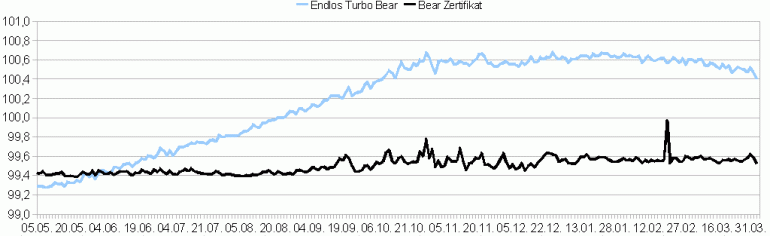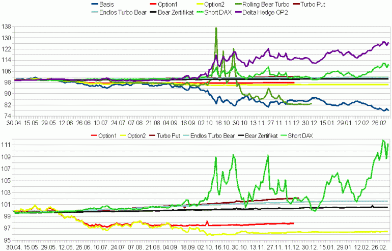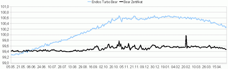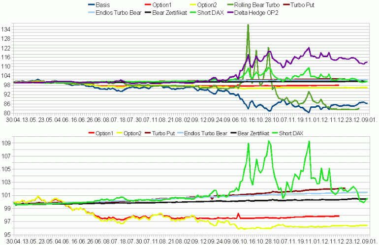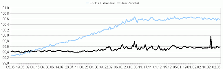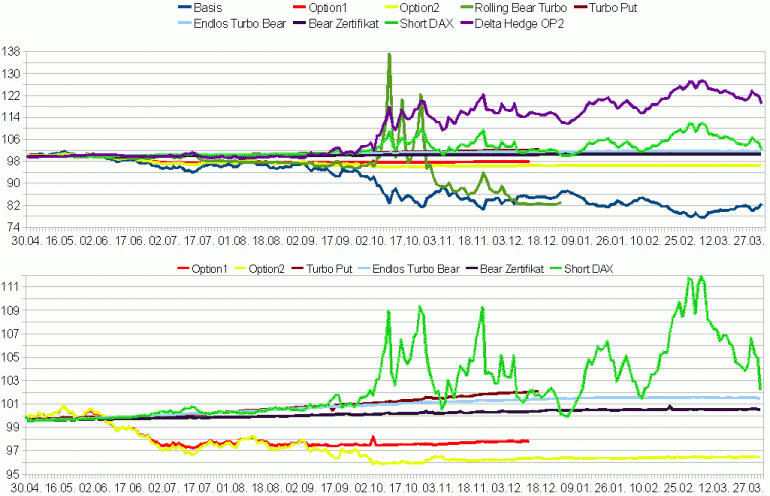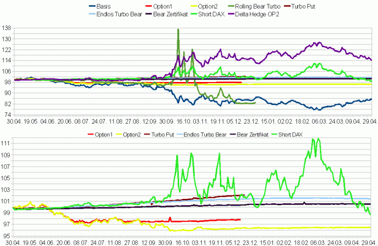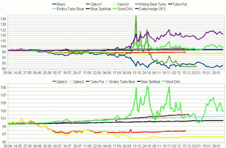 Ich denke, das ist weitgehend geklärt. Die Turbo Zertifikate sind völlig unbeeindruckt von der Aktienmarktentwicklung, natürlich nur bis zum Knock-Out. Der Short-DAX braucht einen Trend, egal ob nach oben oder unten. Bei Seitwärtsbewegungen wird er ein Minus produzieren.