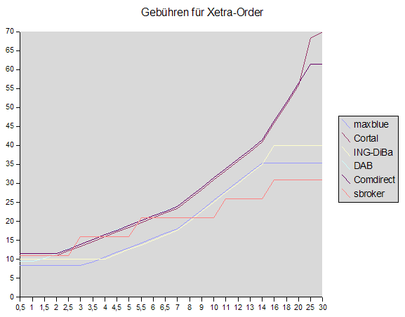 Delphin Mai 3, 2008 · bearbeitet Mai 3, 2008 von Delphin Habe gerade nochmal aus Neugier die Ordergebühren dreier Online.Banken verglichen. Gerade bei größeren Ordern ist sbroker sehr gut. (X-Achse: Ordervolumen in T, Y-Achse: Order-Gebühren in ) Diesen Beitrag teilen Link zum Beitrag