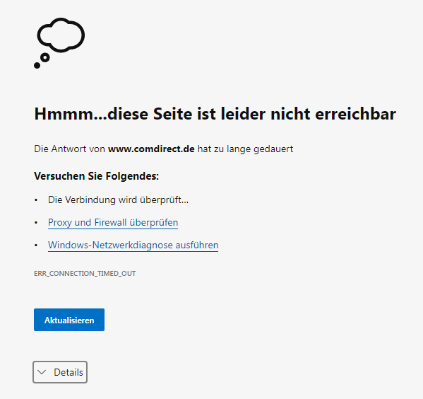 Malvolio Juni 28, 2023 vor 17 Minuten von SlowHand7: Das ist ja wieder vertrauenserweckend wenn die Bank mitten am Tag ohne Vorwarnung einfach offline geht. Was man ja kennt ist daß die Comdirect gerne mal um 0 Uhr den Stecker zieht. Aber dann wird wenigstens noch die Wartungsseite angezeigt. Also bei mir funktioniert alles. Diesen Beitrag teilen Link zum Beitrag
