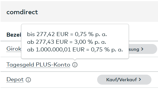 nolske Dezember 2, 2024 · bearbeitet Dezember 2, 2024 von nolske Dopplung vor 9 Stunden von chirlu: Bei mir bislang nicht. Es steht (weiterhin) nur da „bis 999.999.999,99 EUR = 0,75 % p.a.“. Seit heute sieht es bei mir auch wieder so aus. Mal sehen was Morgen ist. Diesen Beitrag teilen Link zum Beitrag