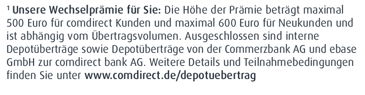 Beans Juli 10, 2015 mir ist gestern ein Flyer für diese Aktion ins Haus geflattert: https://www.comdirect.de/cms/depot_gutschein.html scheint mir ein ziemlich gutes Angebot, 100 Euro Bonus, günstige Orders das 1te halbe Jahr und keine laufenden Gebühren. Oder habe ich einen Haken übersehen? (Neukunde ist klar) Wäre halt perfekt, um mal bei der Übertragungs-Aktion von Consors zu partizipieren Diesen Beitrag teilen Link zum Beitrag