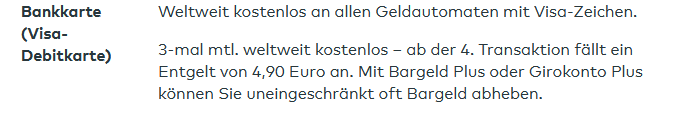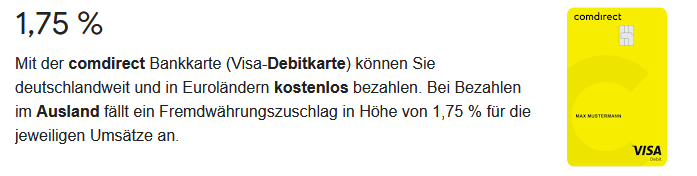Geldhaber März 11, 2021 vor 2 Stunden von west263: mind. seit vorgestern, da meine gestern im Briefkasten lag. Und ist die so schrecklich gelb wie im Comdirect-Forum zu lesen war? - Dort wären Leute z.T. bereit, für ein anderes Design zu bezahlen! Ernsthafte Frage: Mit der "Bankkarte" (Visa-Debitkarte) kann man 3x monatlich kostenlos Geld abheben. Bedeutet das auch, dass bei Bargeldabhebungen außerhalb des €-Raums die 1,75 % für den Auslandseinsatz nicht anfallen? Also tatsächlich kostenlos, wenn man von den im Umrechnungskurs versteckten Kosten absieht? Diesen Beitrag teilen Link zum Beitrag