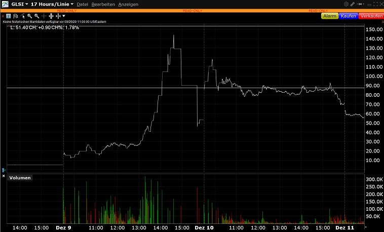 monopolyspieler April 11, 2021 · bearbeitet April 11, 2021 von monopolyspieler Ok- aber für die Kanzlerin darf man. Wenn ich mir den Chart anschaue- dann kann etwas an der Story der codi-Kundin nicht so ganz stimmen. Denn das ist der US-Chart (Ticker GLSI) laut Interactive und demnach ist- wie ich anfangs annahm, der Kurs nicht zu Handelsbeginn hochgeschossen. Die Aktie wurde um 15.30h bereits mit $16.30 gehandelt und erst gegen 19h unserer Zeit ist der Kurs von $26 angestiegen und erreichte den Höchststand gegen 20.30h, Also ist das mit - "war bei $5 und ist dann hochgeschossen " zumindest diesem Anschein nach doch etwas anders gewesen. Ich überlasse es jedem selber, darüber nachzudenken, wie es sein kann, das die Order, wenn sie (was ich jetzt einmal zu Gunsten der Kundin annehmen möchte), denn am oder vor Börsenanfang aufgegeben worden wäre (und es hätten aufgrund der 15 Minuten Zeitdifferenz bei der codi-Kursanzeige noch die $5 vom Vortag dagestanden) nicht bereits zu Kursen von $16 bei Umsatzvolumen um die 2-300.000 Stück ausgeführt worden ist. Das passt doch vorne und hinten nicht, oder habe ich etwas nicht bedacht??? Diesen Beitrag teilen Link zum Beitrag
