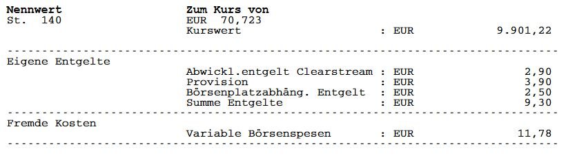 Wegen des Cleastream Entgeltes, vermute ich irgendwie es ist ein exotischer Wert? Wurde da eine Währung umgetauscht? Was sagt denn die Bank bzw. Börse Stuttgart dazu? €11,78 bei unter 10.000 ist ja schon extrem viel für variable Börsenspesen. 11,78/9901,22=0,119%