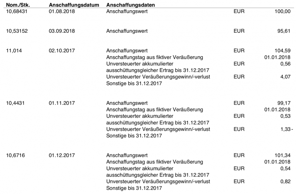 whister Dezember 31, 2018 · bearbeitet Dezember 31, 2018 von whister vor 2 Stunden schrieb Bassinus: Darf ich fragen von welchem Depotanbieter du übertragen hast? Es kommen ja noch Verwahrgebühren dazu, wenn der Verwahrer gewechselt wird. Was hieß das bei dir in Zahlen? Wird das direkt auf den historischen Anschaffungspreis gerechnet oder separat? Der Übertrag erfolgte von der ING-DiBa. Dabei wurden 4 Positionen mit Girosammelverwahrung und eine Position mit Wertpapierrechnung Irland übertragen. Bisher wurden seitens der Onvista Bank keine Gebühren in Rechnung gestellt (von der ING-DiBa selbstverständlich auch nicht). Ich habe mal einen Teil der Übersicht zu den Anschaffungsdaten in den Anhang gepackt: Diesen Beitrag teilen Link zum Beitrag
