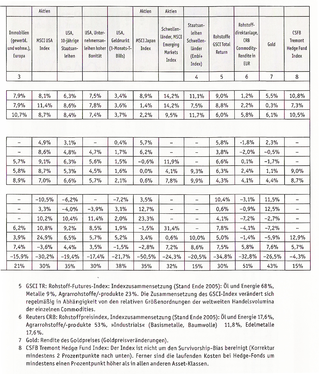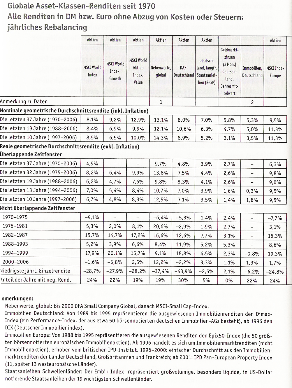 Shjin Juni 2, 2008 Bin mal so lieb und uploade wieder mal etwas! Wie immer mit Quellenangabe. Gerd-Kommer---Globale-Asset-Klassen-Renditen-seit-1970 Hier sehen wir schön: Nominale geometrische Durchschnittsrendite (inkl. Inflation) Reale geometrische Durchschnittsrendite (exkl. Inflation) Deutschland, langfr. Staatsanleihen RexP Nominale geometrische Durchschnittsrendite (inkl. Inflation) - 7.0%, 6.3%, 5.2% ; Tendenz sinkend Reale geometrische Durchschnittsrendite (exkl. Inflation) - 3.9%, 4.4%, 4.1%, 3.9%, 3.5% ; schwankend Staatsanleihen Schwellenländer (Embi+ Index) Nominale geometrische Durchschnittsrendite (inkl. Inflation) - 11.1%, 7.5%, 11.7% - schwankend Reale geometrische Durchschnittsrendite (exkl. Inflation) - 9.3%, 9.9% - schwach steigend Vielleicht können die Profi's hier noch mehr herauslesen. Diesen Beitrag teilen Link zum Beitrag