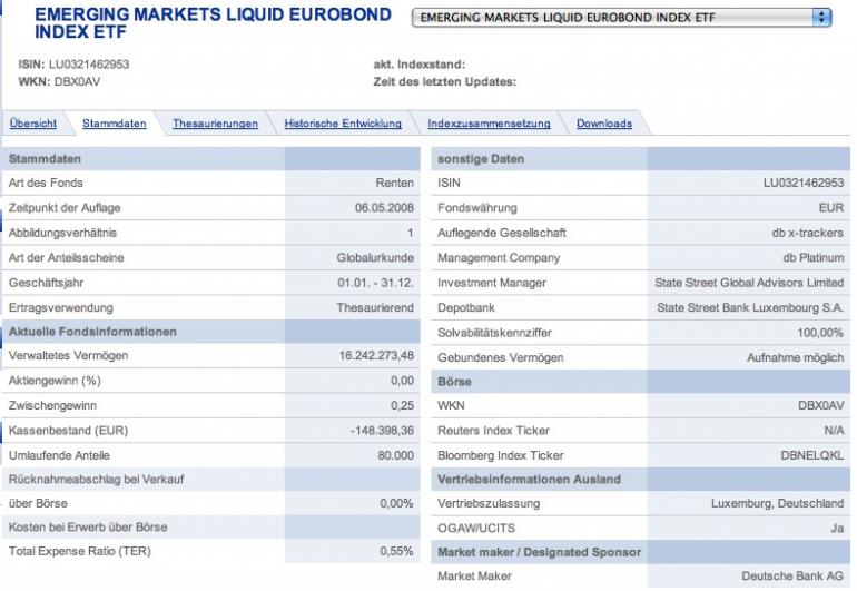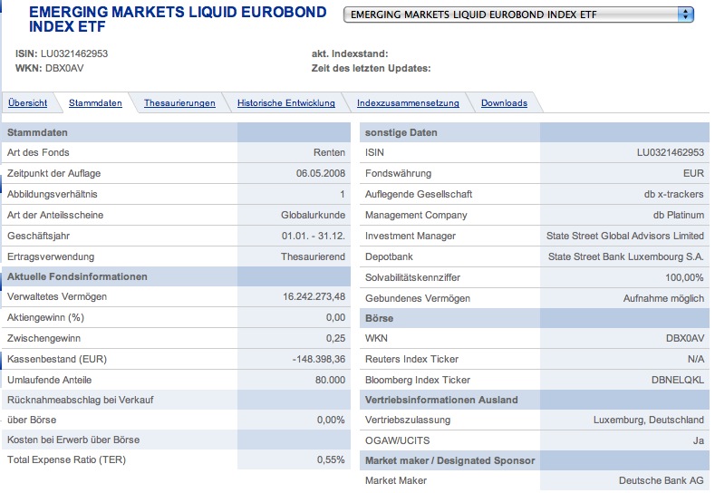 unser_nobbi Juni 9, 2008 Nach etwas suchen bin ich auf einen recht neuen ETF gestoßen:EMERGING MARKETS LIQUID EUROBOND INDEX ETF - ISIN: LU0321462953 Dieser hat eine TER von nur 0,55%. Da dieser ETF rech neu ist, gibt es noch nicht sonderlich viele Kurse. Kennt jemand einen vergleichbaren ETF mit längeren historischen Daten? Der ETF ist neu, der zugrundeliegende Index (EMLE) jedoch nicht. Eine Historie seit 2001 findest Du hier -> Klick Mich Diesen Beitrag teilen Link zum Beitrag
