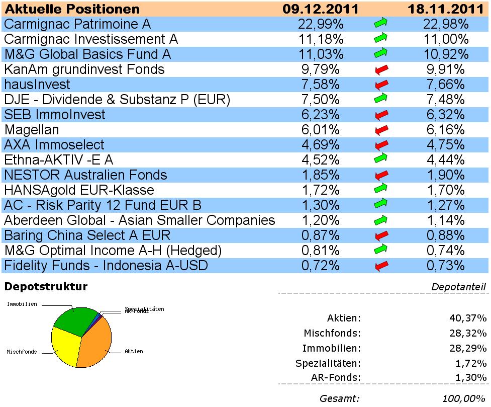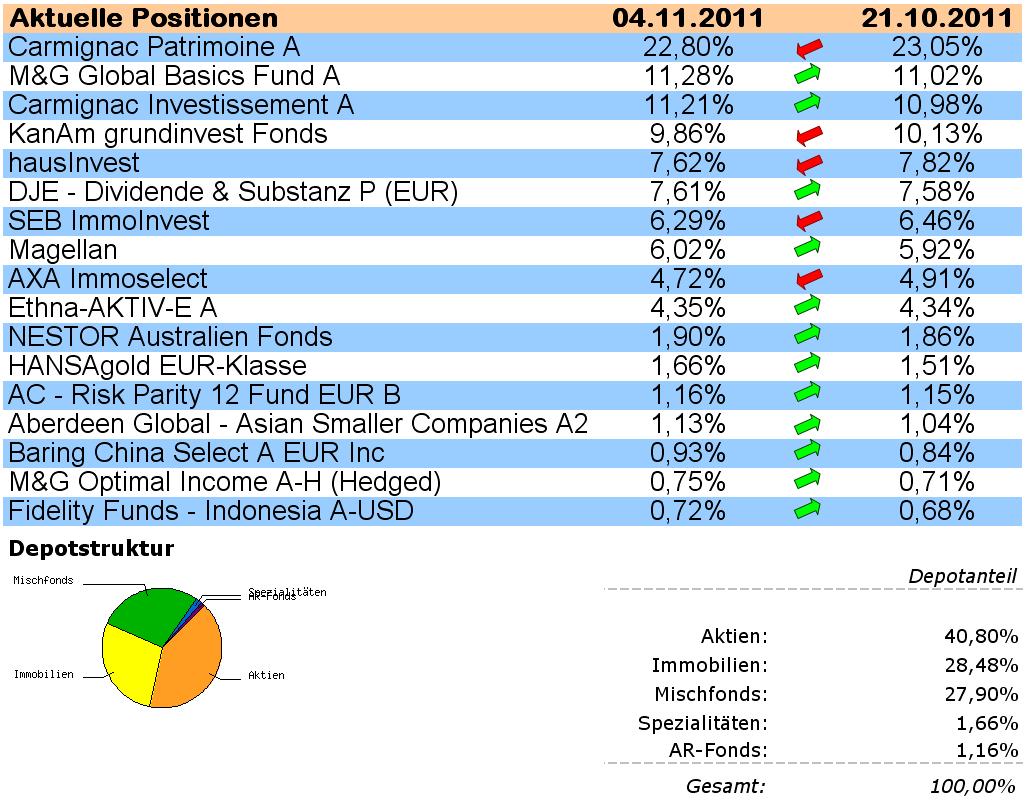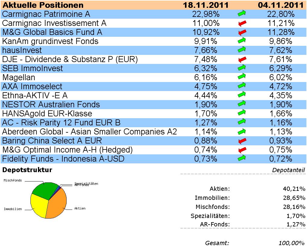 ghost_69 November 19, 2011 ... so mal wieder ein Update: Die letzten beiden Wochen hatten es in sich, am Besten lief Gold, Patrimoine und ein paar Schwellenländer, besonders dort die aus der zweiten Reihe. Kurzfristig gab es einen Platztausch M&G und Carmignac liegt dicht beieinander, bisher hatte der M&G meist die Nase vorn, jetzt ist es umgekehrt. Ghost_69 :- Diesen Beitrag teilen Link zum Beitrag