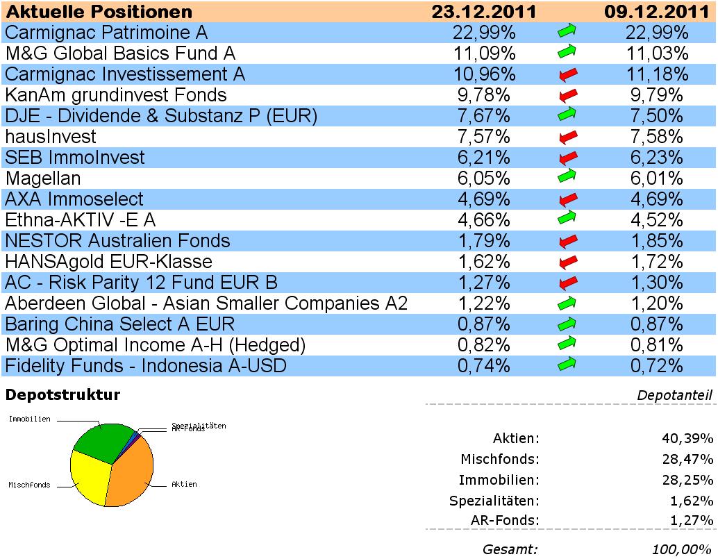 ghost_69 Dezember 11, 2011 · bearbeitet Dezember 11, 2011 von ghost_69 ... mal wieder ein Update: Es gab keinen Platztausch, allerdings wenn man Tageweise ins Depot schaut, geben sich E. Carmignac und G. French sich eine Schlacht um den 2. Platz, mal ist dieser und mal der andere eine Nasenlänge vorne. Bis zum Jahresende werde ich nichts verändern, habe aber ein paar Fonds auf meiner Watchlist, entweder gibt es mal einen Wechsel in den unteren Rängen oder es kommen 1-3 neue Fonds dazu, wie ich es maches weiß ich noch nicht so genau. Achja die Mischfonds sind zum ersten mal stärker als die Immobilienfonds und dieser Trend wird nächstes Jahr weiter ausgebaut. Ghost_69 :- Diesen Beitrag teilen Link zum Beitrag