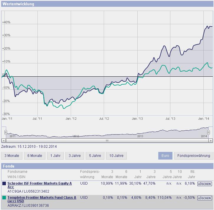 ghost_69 Februar 20, 2014 hast du schon einmal überlegt den Aberdeen EM durch Fidelity EM oder Templeton Frontier zu ersetzen http://www.fondsweb.de/fondsvergleich/LU0231479394-LU0048575426-LU0132412106-LU0390136736 Fidelity Funds - Emerging Markets Fund A USD.pdf Dieser ist ein globaler EM Fonds, aber hat einen anderen Länderansatz daher ist dieser logischer Weise etwas anders unterwegs wie der von Aberdeen. Langfristig finde ich den Aberdeen interessanter: dazu habe ich ja auch noch den Magellan. Templeton Frontier Markets Fund Class A acc USD.pdf Dieser zielt eher auf eine bestimme Region und da mag ich dann eher den von Schroder: Schroder ISF Frontier Markets Equity A Acc 19_02_2014.pdf Ich spiel schon etwas länger mit dem Gedanken dort etwas zu investieren da das die Märkte von morgen sind, aber sie sind auch politisch unstabiler. Ghost_69 :- Diesen Beitrag teilen Link zum Beitrag