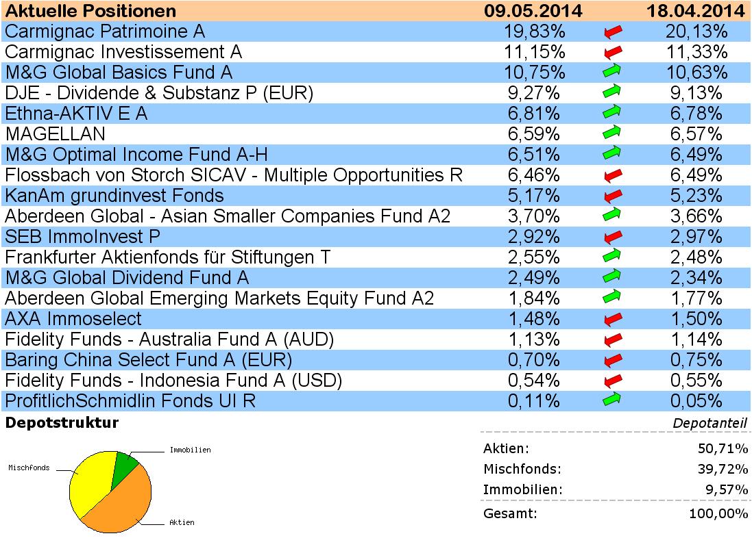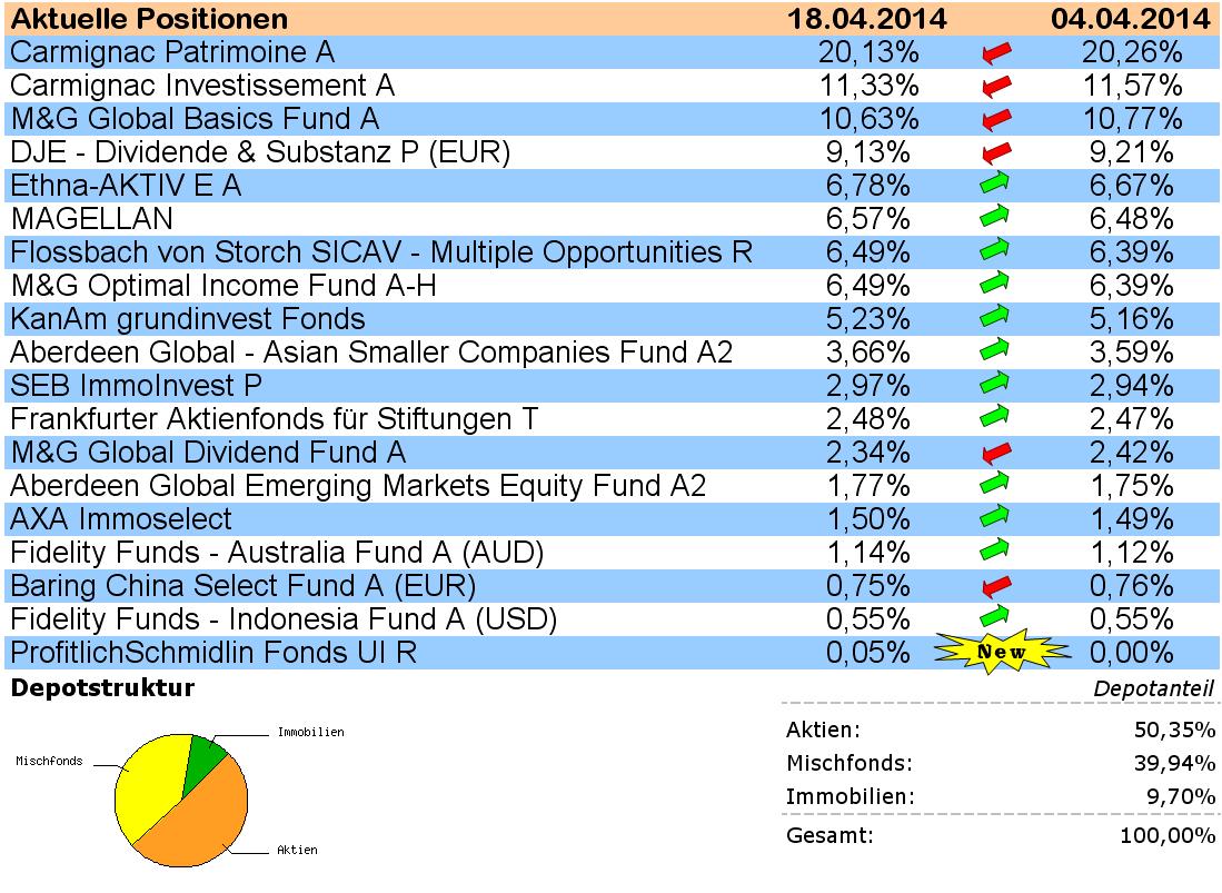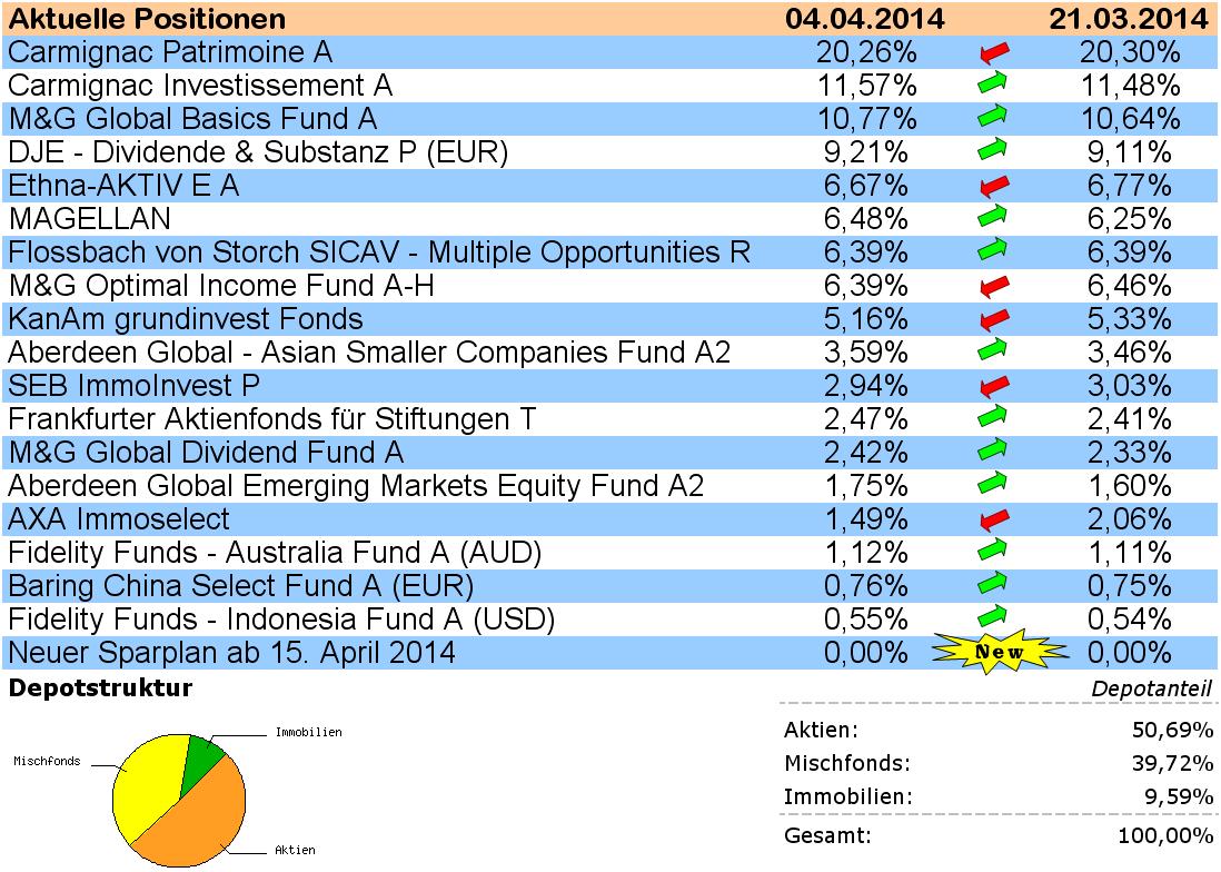 ghost_69 April 5, 2014 ... so nun hier das Update: Diesmal haben die Aktien wieder stärker angezogen, vorallem die EMs sind wieder stärker geworden, der Magellan hat sich dadurch gleich 2 Plätzchen verbessert, auch Asien und der andere Aberdeen Fonds haben stark zugelegt. Der AXA hat ein größere Auszahlung gemacht als gedacht, daher gibt es einen neuen Fonds, indem dieses Geld via Sparplan ins Depot zurück fließt. Auch habe ich einen anderen Sparplan, der schon länger läuft gestoppt, habe davon schon reichlich Anteile und auch Prozentual recht viel im Depot, d.h. der neue Fonds bekommt einen doppelten Sparplan. Ghost_69 :- Diesen Beitrag teilen Link zum Beitrag