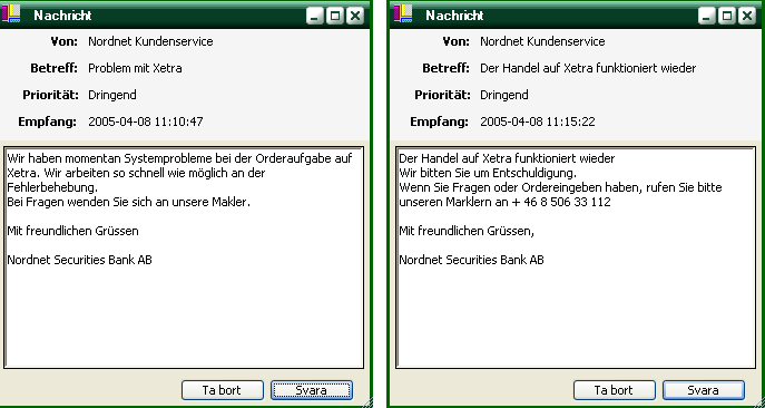 Wenn man sagen wir mal mit 50.000 Euro in einer Aktie investiert ist und die Handelsaplikation WinTrade (letzte Woche jeden Tag) auf einmal keine richtigen Kurse mehr anzeigt und/oder die falschen Bid/Ask´s zeigt, dann halte ich es nicht für Schwachsinn, dass man sich über Fehler aufregt.