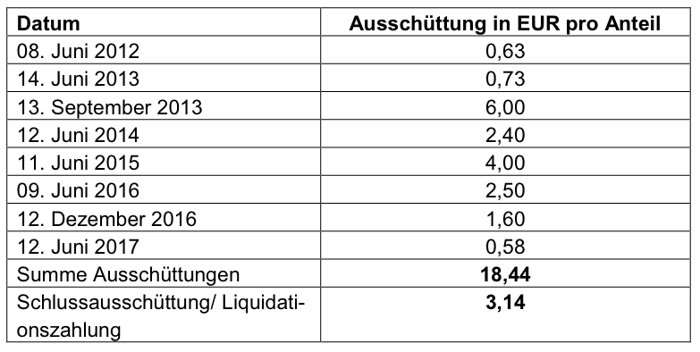 Torman Juni 13, 2013 Weiterhin keine Mitteilung, ob der Fonds noch einmal öffnet oder abgewickelt wird. Inzwischen hält er immerhin 26,1% Cash (31.05.13), was etwa 6,40 Euro pro Anteil entspricht. Der Börsenkurs hat sich deshalb auch etwas erholt. Morgen folgt die jährliche Ertragsausschüttung in Höhe von 0,73 Euro pro Anteil. Davon sind 0,3851354 Euro abgeltungssteuerpflichtig. Diesen Beitrag teilen Link zum Beitrag