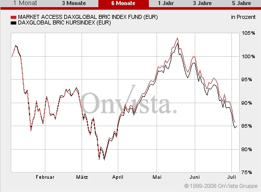 incts Juli 7, 2008 dann möchte ich Dich bitten doch einmal den zweiten Teil Deiner Aussage mit Daten aus sicherer Quelle zu belegen: Also jetzt wirds langsam etwas albern. Aber bitte schön, man ist ja nett: Vergleiche einfach mal den Indexstand hier Deutsche Börse DAXglobal BRIC (Kursindex) mit der Angabe des Referenzindexstandes von hier: ABN AMRO Market Access DAXglobal® BRIC Index Fund. Und falls es dann immer noch nicht ganz klar ist guckst Du mal hier nach: Deutsche Börse DAXglobal BRIC (Performanceindex) Diesen Beitrag teilen Link zum Beitrag