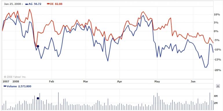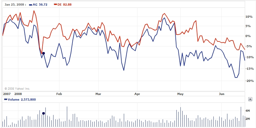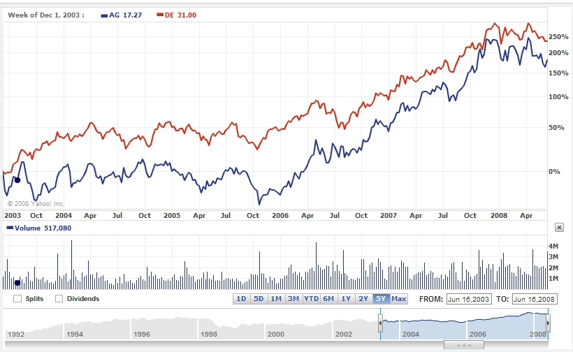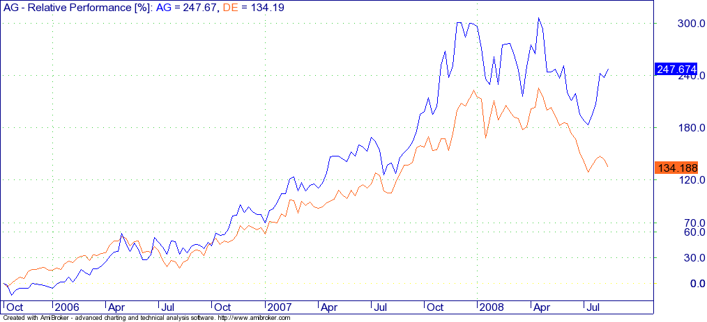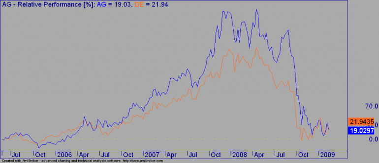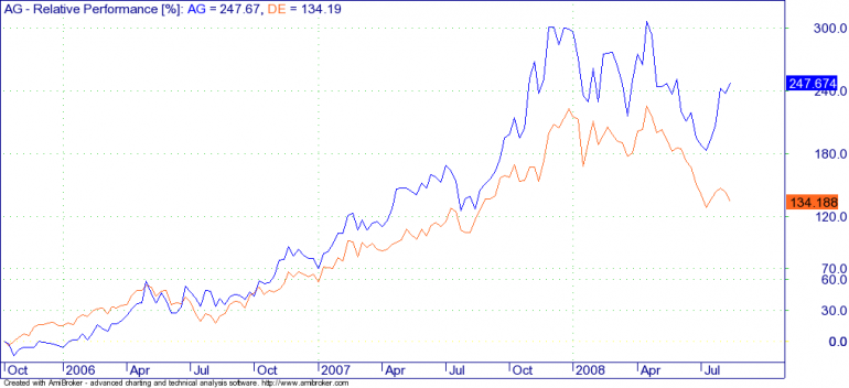 Wenn man das 6-Monatschart (Vorsicht, Farben genau umgedreht zum 5-J Chart!)von DE und AG vergleicht sieht man eine wesentlich höhere Volatilität bei AG. Mein Favorit ist dann doch die finanziell gesünder aussehende DE mit Dividendeausschüttung!