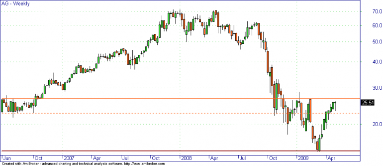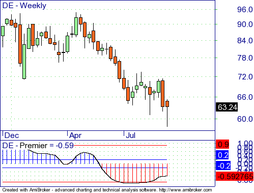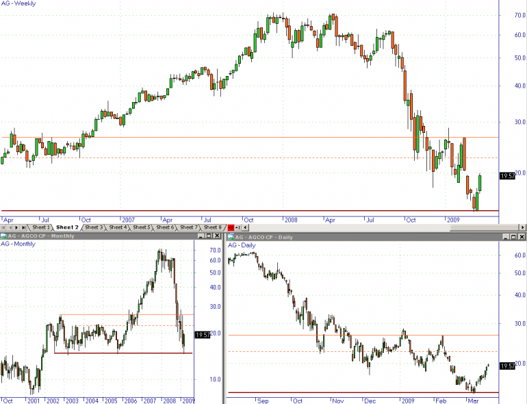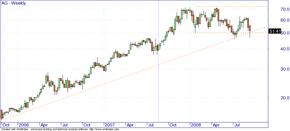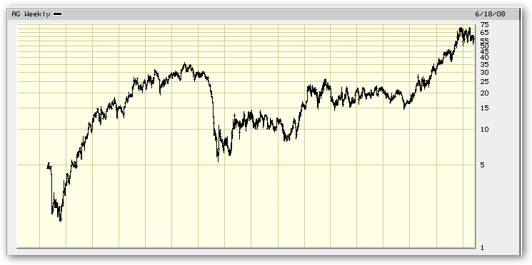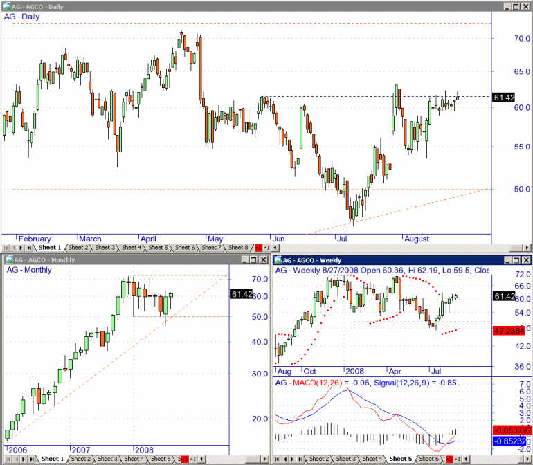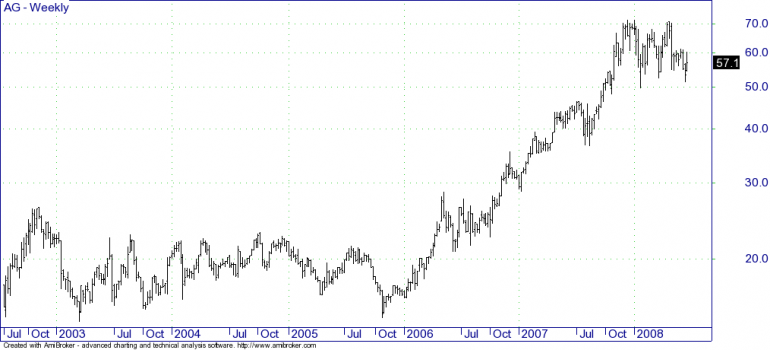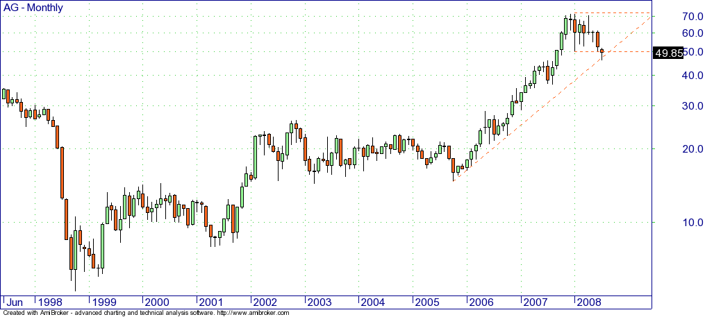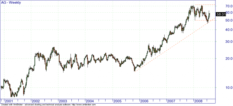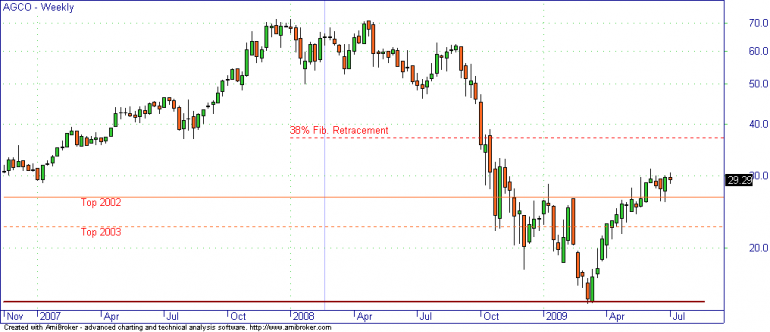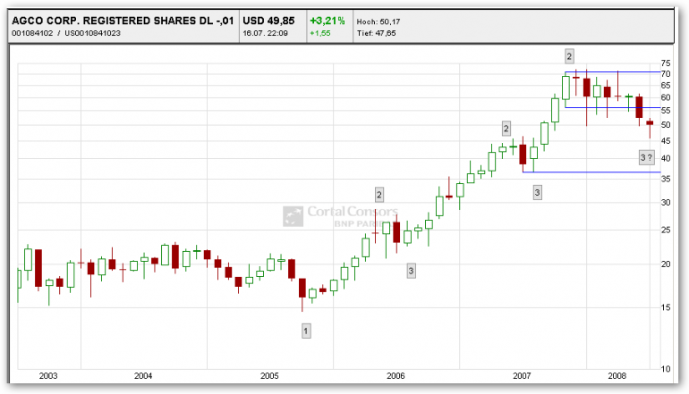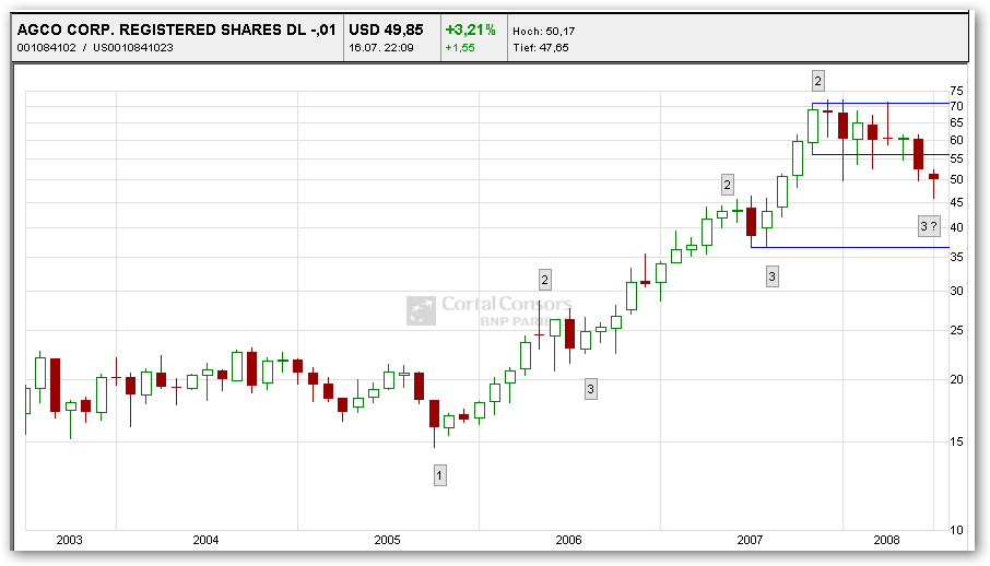 D.h. ein Aufwärtstrend ist eine Abfolge von höheren Hochs und höheren Tiefs. Beim Abwärtstrend entsprechend tiefere Tiefs und tiefere Hochs. Nach der Markttechnik wäre der Uptrend bei AGCO also erst bei einer Unterschreitung des 2007er Tiefs gebrochen.