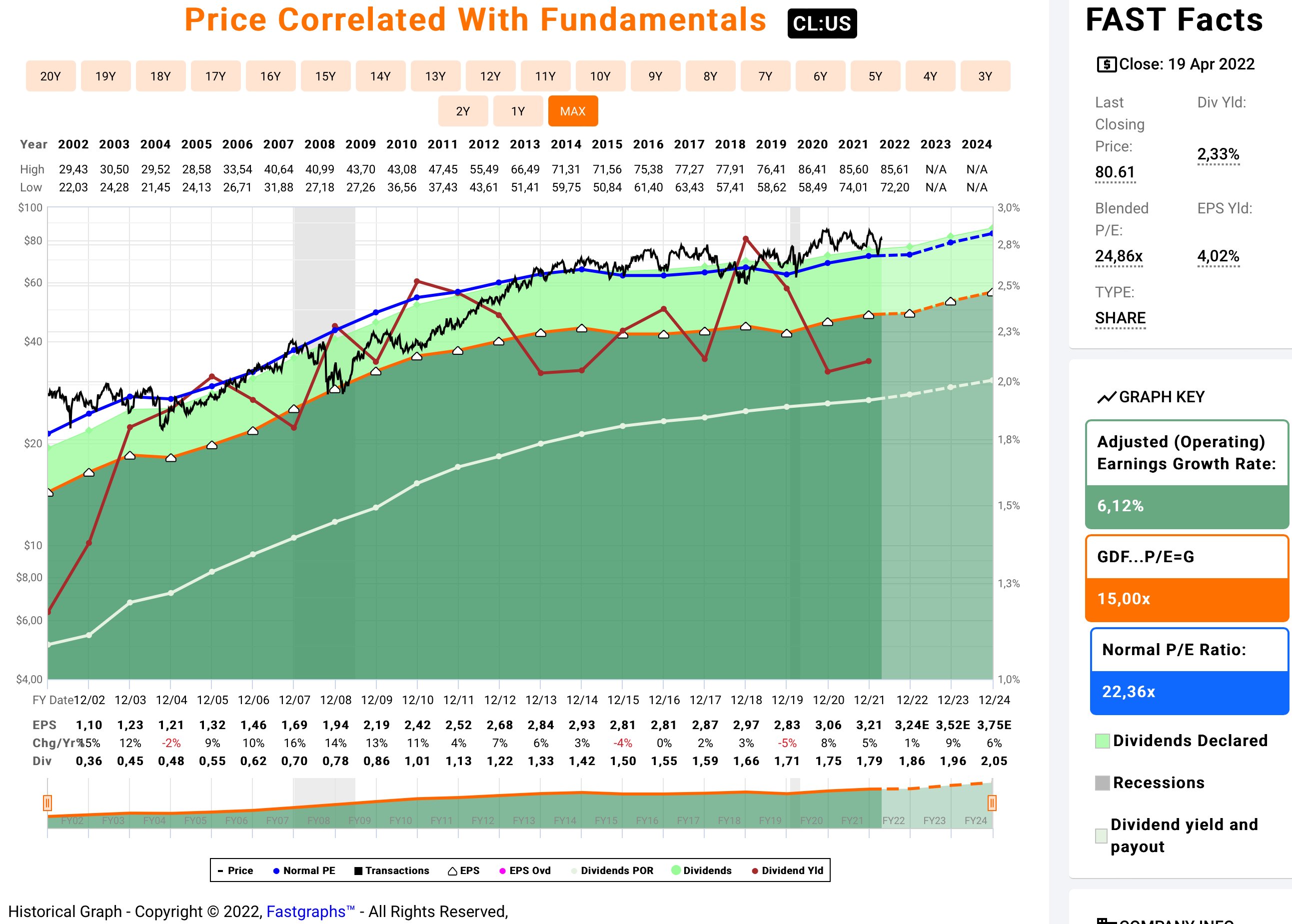 Stockinvestor April 20, 2022 Würde mich auch interessieren, was an der Aktie interessant ist. Ich sehe das wie die Eule. CL ist zu teuer. Bei meiner Betrachtungsweise komme ich auf eine Rendite von 2,5 % in 10 Jahren, wenn man zum jetzigen Kurs kauft. Wobei ich ein wohlwollendes Wachstum von 5 % unterstellt habe. Die Wirklichkeit sieht nämlich noch viel schlimmer bei CL aus. Das Wachstum z. B. auf EPS-Basis geht immer mehr zurück, obwohl kräftig Aktien zurückgekauft werden und ist fast nicht mehr vorhanden. Wird sogar negativ je jünger man den Zeitraum wählt. Bei meinem unterstellten Goodwill-Wachstum von 5 % wäre ein KGV von 15 angemessen. Das Non-GAAP EPS lag laut Seeking Alpha 12/2021 bei 3,21 USD, so dass der faire Wert ungefähr bei maximal um die 50 USD liegen dürfte (15 x 3,21 USD = 48,15 USD). Der Kurs steht aber momentan bei um die 80 USD. Und ist damit erheblich zu teuer. Also ich sehe da beim besten Willen nichts Interessantes bei diesem Kurs. Diesen Beitrag teilen Link zum Beitrag
