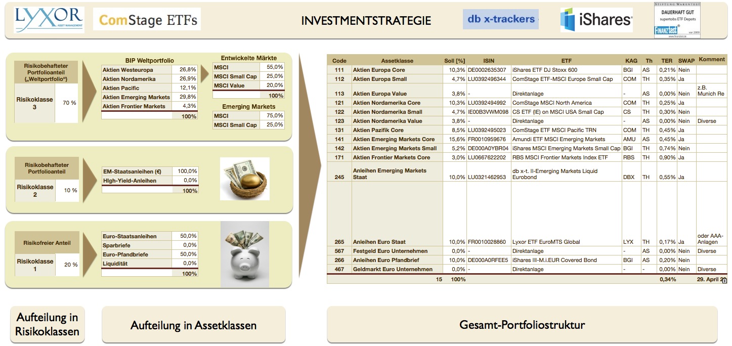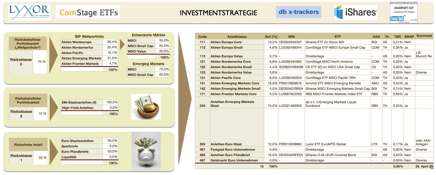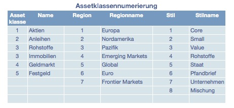 supertobs April 29, 2012 · bearbeitet April 29, 2012 von supertobs Update der Assetklassenverteilung bei Laufzeiten geringer ">10" Jahren Ich habe etwas an den RK-Verteilungen gebastelt und etwas verschoben zwischen RK1 und RK2. Keine teifgreifende Analyse, sondern mehr Bauchempfinden: Wenn man "mittleres Risiko" eingehen kann, bekommt man mit geringer werdendem Anlagehorizont dann so eine Verteilung: Assetcodedefinition Auf Text zu referenzieren ist immer etwas blöd in Excel/Apple Numbers. Ich habe deswegen vor einiger Zeit schon eine Assetklassencodierung bei mir eingeführt. Man kann dann Aktien mit Region etc verketten und sich auf Basis einer Nummer beschreibenden Text generieren: Erweiterung Portfolio Ich habe mich entschieden nun EM Small Cap hinzuzunehmen sowie auch die Frontiers mit hereinzunehmen. Die Positionen haben bald eine Größenordnung der kleineren Übergwichtungen Small und Value (3-5%), ich gehe lieber etwas früher rein und baue das mit frischem Geld auf, als später zuviel umschichten zu müssen: Bei der Auswahl habe ich den iShares MSCI EM Small statt dem SPDR MSCI genommen, letzter hat einen Mörderspread von 2-3 % gegenüber ca. 0,5%. Da muss man ewig halten um die 0,1% TER wieder reinzuholen. Statt dbx Select Frottier habe ich den neuen RBS MSCI Frontier genommen, dann bin ich gleich in meiner gewünschten MSCI Kategorisierung und somit durchgängig zum MSCI EM. Auch ist der MSCI deutlich weiter um die Welt gespannt (hat mehr Länder). Die Value-Übergewichtung würde ich wie mehrfach erwähnt durch Einzelaktien gestalten. So bin ich mit z.B. Munich Re recht happy. ETFs sind Beispiele die ich selber halte. Diesen Beitrag teilen Link zum Beitrag