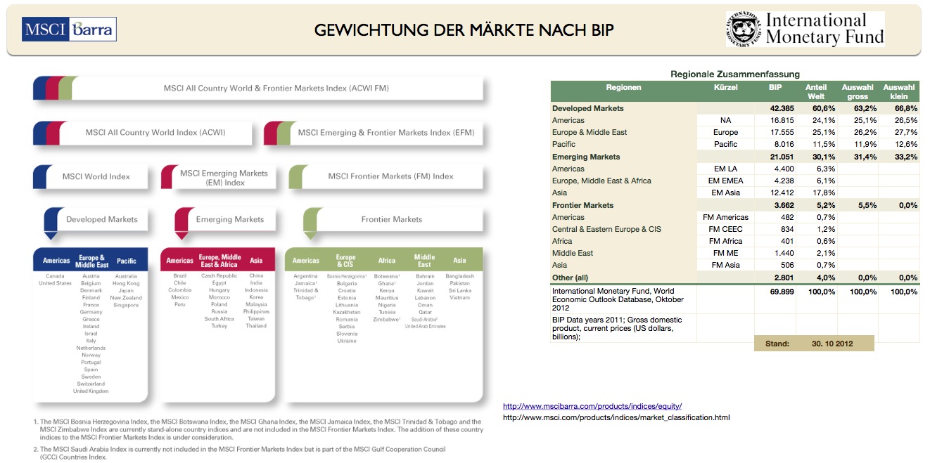 supertobs März 9, 2013 · bearbeitet März 9, 2013 von supertobs Neue BIP-Daten aus Oktober 2012 Habe obige Diskussion zum Anlass genommen mein Update endlich nachzuziehen. Jeweils Oktober und April gibt es ja neue IMF-Daten. Änderungen und Anmerkungen: - 2 neue Länder in der Statistik (San Marino und Süd-Sudan) - Isreal war schon länger bei mir drin (s.o.) - Neue Graphik und Webseite bei MSCI - Ich nehme nach wie vor "Europe & Middle East" statt nur "Europe" bei MSCI. Letzteres wäre auch möglich, ich halte mich aber an die Übersichtsgraphik - Venezuela raus - Saudi Arabien (wie auch die anderen noch nicht offiziell zur Region zählenden Länder aber schon in der Graphik antizipierten Länder nehme ich auch rein - In der Verteilung tut sich wenig. FM geht etwas hoch, da aber Saudi Arabien jetzt neu dabei ist. - 77 der 186 Länder der Welt steuern 95% des BIPs bei. Da ist noch viel zu tun und viel weltweites Potential. Diesen Beitrag teilen Link zum Beitrag