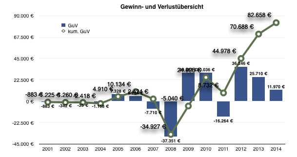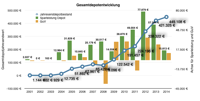 supertobs April 22, 2014 · bearbeitet April 26, 2014 von supertobs Jahresrückblick 2013 Etwas verspätet, aber nun doch. Mich hat einiges zeitlich zurückgeworfen. Ich habe auch viel an meinem Tool programmiert. Einzahlungen 2013 waren die Einzahlungen nicht ganz so hoch wie 2012. Der kleine Einmaleffekt war auch nicht da. Weiterhin habe ich für die Altverlustverechnung einige Papiere verkauft (siehe auch unten) und Gewinne realisiert und entsprechend Steuern von fast 4k gezahlt. Die fehlen natürlich in dem Jahr in der Wiederanlage und kommen erst mit der Steuererklärung 2013 zurück.Ausblick 2014 ist alles nach Plan. Depotstruktur 2012 hatte ich mich entschieden Frontier Markets und Emerging Markets Small mit in das Depot zu nehmen. Ich habe mein Strukturbild angepasst und gebe keine konkrete ETF-Empfehlung an, zur ETF Auswahl gibt es im Forum massig Informationen. BIP-Daten noch aus dem Oktober 2013. Das Depot ist Ende 2013 bei 420k (GuV ohne Erträge, da keine Neuanlage): Ich bin eigentlich immer durch die Neuanlagen Rebalanciert, das gleiche Bild zeigt sich bei den Kinderdepots. Rebalancing ist also auch in diesem Jahr in wenigen % nötig: Ich habe (noch) etliche Einzelinvestments (Graphik ist etwas unsauber und zeigt die RK1 und RK2 Einzels auch oben mit an): Diversifizierung Nach KAGs, Thesaurieren, Währung und Swappern ist mein Depot so aufgestellt, interessant ist der kleine Euro-Anteil in den Aktien (nur grobe Übersicht). Einzelne ETFs (z.B., EMLE und RK1) nagen an der 50k-Grenze: Dies war ursprünglich auch mal gedacht nicht zu überschreiten. Bei 10 RK2 und alles in EMLE sind bei 500 k Depot aber diese Größenordnungen erreicht. Alternative zum EMLE habe ich aber noch nicht richtig gesucht. Depotperformance Auch 2013 habe es wieder einen deutlichen positiven Depoteffekt aus Kursgewinnen und Erträgen: Hier die absolute Performance des Depots (Die Auswertung ist noch etwas Baustelle) (siehe 2 Posts weiter unten, neue Graphik) Direktanlagen Würde gerne noch die 10 Aktie als Einzelinvestment meiner Anlagephilospohie weiter entwickeln (ich wollte mit 10 Aktien die Regionen, die Branchen und die Assetklassen abdecken). Zur Zeit habe ich 6 Aktien und komme zeitlich da nicht so hinterher. Anleihen habe ich alle verkauft, das breite Investment hat doch zur Zeit mehr Vorteile als in einzelne Länder zu gehen. Auf 10 Aktien gehe ich aber mittelfristig noch, 10 mal 10k pro Position. RK2-Anlagen machen zwar Spaß, aber gerade die EUR-Anleihen sind doch etwas rar, der EMLE ist ja auch hauptsächlich in USD. Die komplette Verteilung über 1-10 Jahre, im gesamten Ratingbereich in EUR ist doch recht schwierig. Nach 5-6 Papieren wird die Luft dünn, es bleib also beim EMLE. So sieht es bei Aktien aus: Die Verteilung: Statt der Anleihen habe ich die 4 Festgeldpositionen in meine Übersicht (Bond-Ladder) integriert: Das Rating der Einzeltitel berechne ich nach "Forumsformel" und unter zur Hilfenahme einer Rangfolge (andere Banken als Ing-DIba nur Infos): Damit stehe ich hier in der allgemeinen Verteilung: Anlegerverhalten Zum zweiten Male nach der Abgeltungsteuer bin ich von Buy-and-Hold etwas abgewichen und die Altverlustverechnung umsetzen zu können. Dadurch war der Umschlag im Depot höher, die Kennzahl bezieht sich auf Käufe/Nettoinvest. Schön zu sehen ist die niedrige TER eines passiven Depots. Senken läßt sich nur noch mit mehr Arbeit durch Direktinvests. Altverlustverrechnung In Summe ist mir in 2012 (erste Übungen) und 2013 eine Alverlustverechnung von 19k gelungen. Damit bleiben also knapp 3k Altverluste ungenutzt. Dies ist mir den Depotgewinnen gelungen, weitere Schiebepapiere etc habe ich nicht gebraucht. Die 3k habe ich dann verfallen lassen. Steuer Hier sit die Hauptarbeit in mein Tool geflossen. Ich habe klarer getrennt zwischen Depotumsätzen (Kauf und Verkauf) und der dazugehörigen Steuer. Daneben habe ich noch eine riesige Tabelle mit "Erträgen allgemein" wo ich jeden Ausschüttung und Thesaurierung eingebe. Die Steuer ergibt sich dann sauber als Auswertung aus Umsätzen und Erträgen. Das war vorher ein heilloses Chaos, Stückzinsen hatte ich bei Erträgen, sie gehören aber zu den Umsätzen etc. Mit der neuen Übersicht bin ich ab 2009 mit neuem Steuerrecht in der Lage meine KAP-Steuererklärung zu automatisieren. Mehrere Anläufe waren dazu nötig. Gelöst habe ich es mit einer 1:1 Programmierung der Ing-DiBa Eträgnisaufstellung. Die hat bei mir fast 20 Seiten. Dies ist Schritt für Schritt umgesetzt und alle verschiedene Teilbeträge zu berechnen. Dies hat mich auch zur klareren Struktur meiner Umsatz- und Ertragstabelle gebracht. Hier ist ein kleiner Eindruck dieser Rechnung. Ganz unten erzeuge ich mir automatisch Text den ich bei der Steuerklärung hinzufügen kann (ausl. Quellensteuer, fehlende ausl. Thesaurierer, Vermeidung Doppelbesteuerung). Das wa rmein Q1 2014 Werk. Bin sehr happy damit: In den Vorjahren war ich meist noch unter dem SteuerFreibetrag, durch hohe Erträge hat es hier aber pressiert. Hier sind die Erträge dargestellt (negativ weil "aus dem Depot fließend"). Fast 8k waren das letztes Jahr, wirklich Auszahlung (ihn Thesaurierer und nach Steuern) nur die Hälfte. Vorsorge Mein Hinterbliebenenschutzkonzept wird nicht geändert. Weitere Risiko-LVs mache ich nicht, da langsam genug Vermögen da ist. Sonstiges und Ausblick 2014 Keine größeren Veränderungen geplant. In 2013 nach 2 Jahren in der neuen Firma wurde mir ein zweites Geschäftsfeld übertragen mit Verdreifachung der Probleme ;-). Daran nage ich noch... Nächster Jobwechsel erst ab 2015 eingeplant. An Forumsdiskussionen nehme ich i.d.R. nicht mehr teil, Zeit geht nur noch in das Tool, vor allem Steuer. Viele Grüße, supertobs Diesen Beitrag teilen Link zum Beitrag