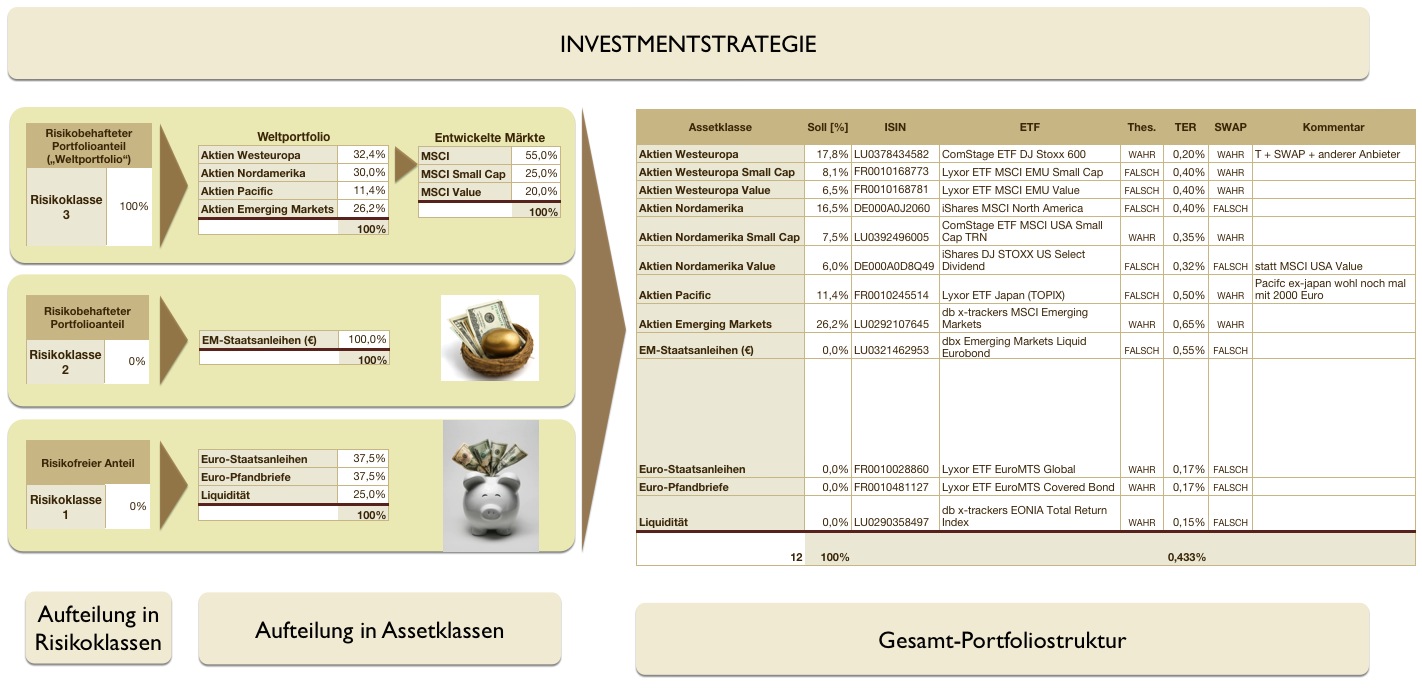abrakadabra1 Dezember 24, 2008 Hallo supertobs, mit Deinem letzten Beitrag zum Thema "aktuelle Wirtschaftslage" und mit Deiner Arbeit des letzten Jahres hast Du meine persönliche Investitionsstrategie maßgeblich beeinfluss und meine Vernunft gestärkt, um das Thema Timing auszublenden und doch noch dieses Jahr rein zu gehen. Aktien 70% Aktien North America MSCI 18% A0J206 iShares MSCI North America Aktien Westeurope MSCI 21% ETF060 ComStage ETF DJ STOXX 600 TR Aktien Pacific 7% DBX1MJ db x-trackers MSCI Japan TRN ETF Aktien Emerging Markets 20% DBX1EM db x-trackers MSCI Emerging Market TRN Aktien Russia (weil meine Heimat ist) 4% ETF118 ComStage ETF MSCI Russia Capped 30% TRN Anleihen 30% Euro Staatsanleihen 10% A0B9ED Lyxor ETF EuroMTS Global Euro Unternehmensanleihen 10% 251124 iShares EURO Corporate Bond Liquidität / Tagesgeld 10% DBX0AN db x-trackers II EONIA TRN ETF Absolte Knallerargumente, dieses Jahr noch reinzugehen: - Investitionsstrategie liegt in der Zukunft - Vermögensbildung auf 3 Säulen: Riester, Gehalstumwandlung, Depot - persönliche Risikobereitschaft .... auch meine Frau würde das Geld zu Hause verstauen. Ich danke Dir für Deinen wertvollen Input und wünsche Dir und Deiner Familie glückliche Festtage und ein gesundes Neues Jahr! Gruß SB Diesen Beitrag teilen Link zum Beitrag