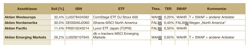 supertobs Dezember 16, 2008 · bearbeitet Dezember 16, 2008 von supertobs Hallo supertobs, ich habe eine Frage zum LYXOR ETF MSCI EMU VALUE, den Du in Deinem Musterdepot hast. Der Fonds ist ein Swap-Fonds, der im elektronischen Bundesanzeiger unter Nr. 1. a eine Ausschüttung von 5,8 Euro ausweist. Unter Nr. 1. b (ausgeschüttete Erträge) wird ein Betrag von 0,00 angegeben. Dies bedeutet doch, das die Ausschüttung steuerfrei ist, oder sehe ich das falsch? Nein, das siehst Du richtig. Steuerfreie Ausschüttung. Wäre der COMSTAGE ETF DOW JONES EURO STOXX SELECT DIVIDEND 30 (LU0378434236) trotzdem nicht die bessere Value-ähnliche Alternative? Dieser Fonds thesauriert steuerfrei und es gibt nicht das Problem der steuerpflichtigen Neuanlage der Ausschüttungen wie beim LYXOR ETF MSCI EMU VALUE, dessen Ausschüttung immerhin über 6 % beträgt und damit nicht mehr steuerfrei ist. Das ist nichts. ich mache nur bei USA eine Ausnahme, weil es dort nichts andres gibt. Die Select Dividend 30 sind zu markteng und wohl auch zu volatil. Der MSCI Value deckt die Hälfte des Gesamtmarkts (eben den Value-Teil) ab. Es gibt bei "Fondsprodukten" einen längeren Thread dazu. Ich denke nur noch über eine Änderungen nach: - LU0322253906 db x-trackers MSCI Europe Smallcap statt FR0010168773 Lyxor ETF MSCI EMU Small Cap weil dbx ein größeres Volumen hat und zudem thesauriert. Das werden wohl einfach nur falsche Bezüge zu irgendwelchen Zellen sein, wie man es von Excel kennt Ja, das sind eigentlich Tockboxen in Apple Numbers die beim Export nach Excel so umgewandelt werden. SWAP "wahr" heißt eben, das der Fonds SWAPs einsetzt. TER = Total Expense Ratio, Kostenquote des ETFs. Diesen Beitrag teilen Link zum Beitrag