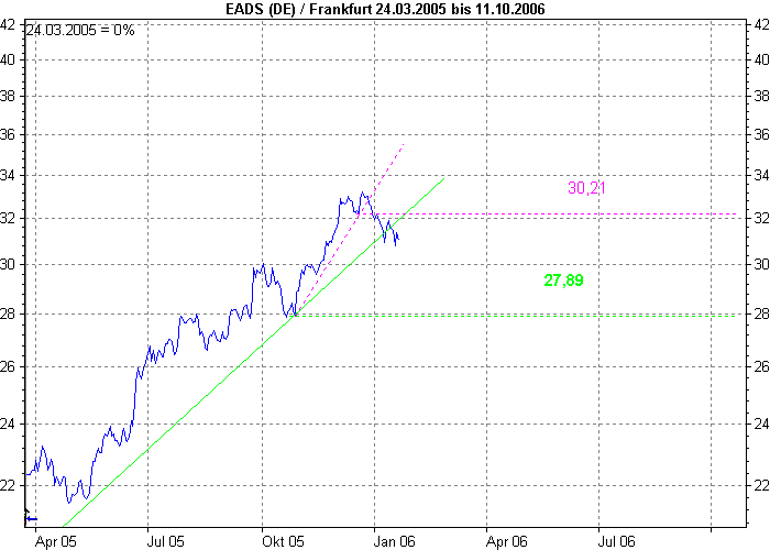 andy Januar 22, 2006 Ja, ich denke da hast du nicht die schlechteste Entscheidung getroffen. Langfrisitg gesehen denke ich hast du mit EADS eine gute Wahl getroffen. Kurzfristig kann es allerdings noch etwas weiter runter gehen, die horizontale Unterstützung liegt bei 27,89 Euro. Ich denke aber, dass die Aktie nicht bis dahin konsolidiert. Der kurzfristige Aufwärstrend (lila) wurde aber schon gebrochen. Aufpassen sollte man aber momentan auf die etwas "schlechte Stimmung" für die Reise/Tourismusbrange, die durch die Panikmache mit Vogelgrippe hervorgerufen wird. Diesen Beitrag teilen Link zum Beitrag