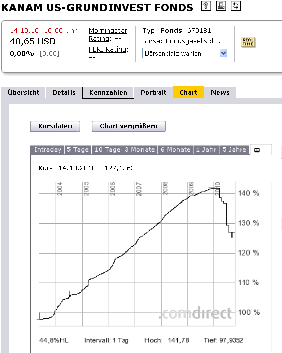 Berücksichtigt man, daß die Fondsauflage zum denkbar ungünstigsten Zeitpunkt erfolge (was die Kanam-Leute in ihrer Glaskugel natürlich hätten kommen sehen müssen ;) ), ist das eine sehr respektabe Managementleistung - vorausgesetzt, der Rest-Fondswert wird nicht völlig pulverisisert, wovon ich aber nicht ausgehe.