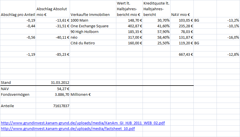 2.) Wenn Du mit dem Gesamtfondsvermögen rechnest, dämpft die jeweils vorhandene Liquidität Deinen berechneten Verlust. Je höher die Liquidität ist, desto mehr weicht Dein Ergebnis von dem wahren Verlust aus dem Verkauf der Immobilie ab. Allenfalls kann man noch die 5-6% Liquidität bei Verkaufsankündigung ansetzen. Die dämpft in der Tat den Velust der Anleger ein wenig.
