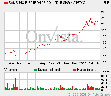 avanti_core März 7, 2006 aktueller Stand = 213 Euro in Frankfurt. Der Kurs hat sich aus dem ALLTIMEHoch von 240 Euro leicht entfernt, und ist in den letzten Tagen gesunken. Es könnte sich eventuell Einstiegspositionen ergeben, aber für mich lohnt es sich unter 200 Euro einzusteigen. Ich werde weiterhin die Koreanischen Werte beobachten, könnte sein das Samsung so stark wie hyundai korrigiert. Diesen Beitrag teilen Link zum Beitrag