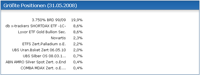GrübelFranz Juli 19, 2008 Hallo zusammen, bin neulich auf diesen "vermögensverwaltenden Superfond" gestossen. TER: 1,45% mit 10% Perf.fee (Highwatermark) Perf. 1 J: 14,29% Weitere Daten z.B. hier Factsheet: Factsheet_M___W_Capital__Juni_08.pdf Was sagt ihr zu dem Fonds, wo sind die Stärken und Schwächen? Diesen Beitrag teilen Link zum Beitrag