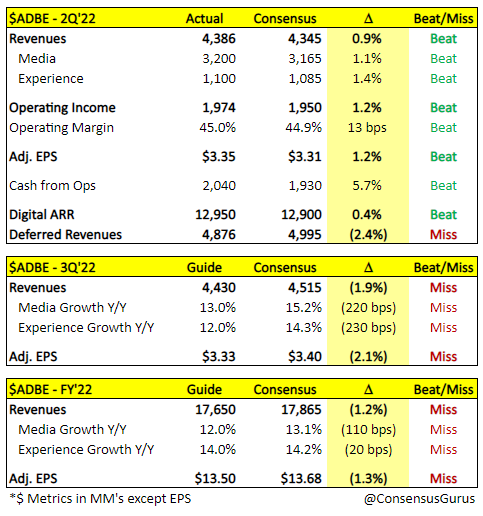 Ju24 Juni 16, 2022 Adobe Q2 Earnings Top Estimates, but Q3 Outlook Below Consensus Donnerstag, 16.06.2022 22:15 von PLX - Aufrufe: 78 (PLX AI) – Adobe Q2 adj. EPS USD 3.35 vs. estimate USD 3.31. • Q2 EPS USD 2.49 • Q2 EBIT USD 1,530 million • Q2 net income USD 1,180 million • Q2 adjusted net income USD 1,590 million vs. estimate USD 1,550 million • Q2 adjusted EBIT USD 1,970 million vs. estimate USD 1,950 million • Outlook Q3 revenue USD 4,430 million; consensus USD 4,513 million • Outlook Q3 EPS USD 2.35 • Outlook Q3 adjusted EPS USD 3.33; consensus USD 3.40 • Says Q3 will be impacted by the ongoing war in Ukraine, and Adobe’s decision to cease all new sales in Russia and Belarus • Sees an incremental FX headwind of $175 million across Q3 and Q4 fiscal year 2022 revenue von Ariva.de Adobe fällt auf ca. 331.- bei L&S Diesen Beitrag teilen Link zum Beitrag