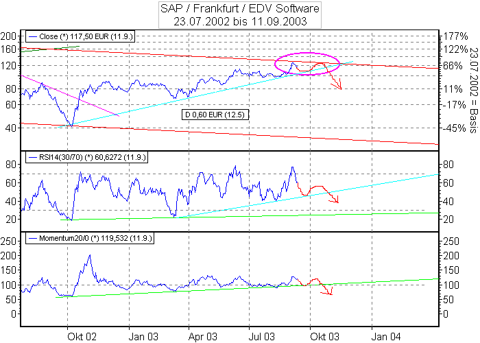 Aktiencrash September 12, 2003 Hier mal einen neuen Chart von SAP B) auf Wochenbasis . Sieht ja völlig krass aus ! Die Aktie ist mal wieder am mittelfristigen bzw langfristigen Abwärtstrend (rote obere Linie) angekommen (violetter Kreis). Die Indikatoren haben mittelfristig eine bärische Divergenz (dicke rote Linie) gebildet. Kurzfristig konnte sich wieder einmal eine bullische Divergenz (hellgrün) etablieren. Wie man im Momentum schon sehen kann, bildet sich eine kurze bärische Divergenz (dicke violette Linie) heraus. Das bedeutet, das der Kurs steigt, das Momentum diese Bewegung aber nicht mehr mitmacht. Bricht der Trend ist das ein Zeichen für eine Trendwende. Die Trendlinienen bei Momentum und RSI sind zwar noch intakt, aber es ist fast ausgeschlossen, das der Abwärtstrend (rot) überschritten wird. Diesen Beitrag teilen Link zum Beitrag