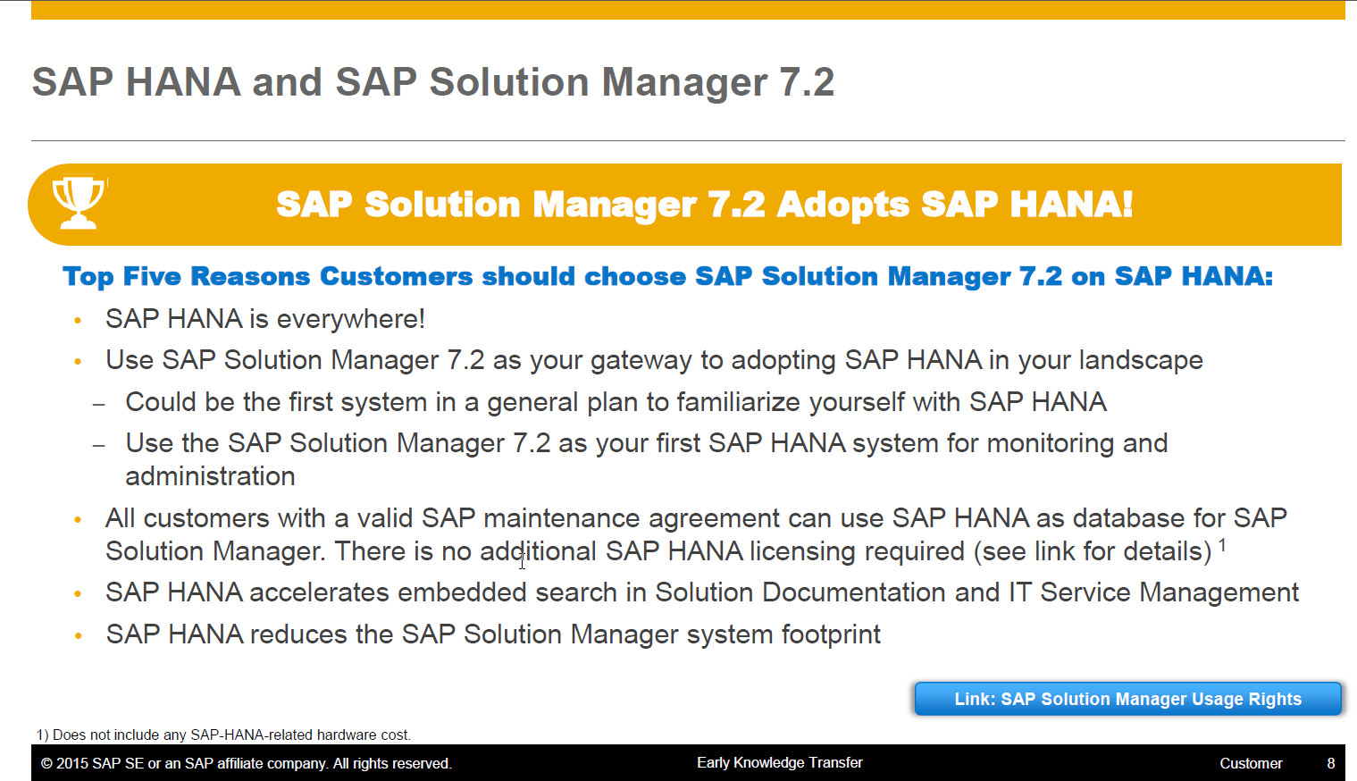 Wutschi Januar 30, 2016 · bearbeitet Januar 30, 2016 von Wutschi Bin soeben über eine interessante Info gestolpert: Der Solution Manager 7.2 ist seit Anfang des Jahres im Ramp up. Der Solution Manager 7.2 läuft auch auf HANA und der Betrieb des SolMan auf HANA ist jetzt lizenzkostenfrei. Kurz zum Hintergrund. Der SolMan ist eine Werkzeugsammlung zum Betreiben von SAP Systemen. Dort kann das Testmanagement, Change Request Management, IT-Service Management, Monitoring, usw… laufen. Der Solution Manager ist lizenzkostenfrei, das jetzt SAP hier auch die HANA Datenbank lizenzkostenfrei zur Verfügung stellt, gibt es vielen Kunden die Möglichkeit die Vorteile von HANA kennen zu lernen (Hardwarekosten bleiben natürlich). Alle SAP Kunden haben den SolMan mehr oder weniger stark im Einsatz. Quelle ist eine Präsentation die nicht frei zugänglich ist, habe mal nen Screenshot angehängt. Sowie das hier (Folie 2): https://support.sap....0Agreements.pdf Ich interpretiere mal das SAP HANA verstärkt in den Markt drücken will Diesen Beitrag teilen Link zum Beitrag