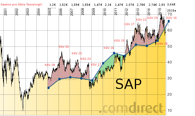 finisher September 11, 2015 · bearbeitet September 21, 2015 von finisher Ich habe bereits eine kleine SAP Position im Depot und überlege zu den jetzigen Kursen nachzukaufen. Der Kurs scheint wieder in einem günstigen Bereich zu sein, sofern die 2016er Gewinn-Prognosen sich bestätigen sollten. Anmerkung: Die blaue Linie stellt den Bereich dar, in welcher der Kurs bei einer dem KGV-Durchschnitt entsprechenden Bewertung gewesen wäre. Ich finde das hier ist ein ganz interessanter Artikel, wie es bei SAP weitergeht: http://www.handelsblatt.com/unternehmen/it-medien/sap-steuert-um-mehr-cloud-weniger-gewinn/12082916.html Diesen Beitrag teilen Link zum Beitrag