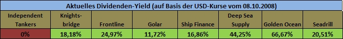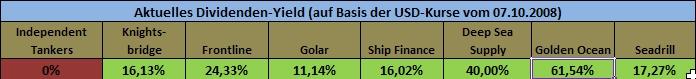 Dagobert2 Oktober 8, 2008 Kaum hat man Urlaub und zwei Wochen keinen Internetzugang und schon steht alles an den Börsen auf dem Kopf und selbst die verrücktesten Kauflimits sind gerissen und unterboten Anyway, ich bin wieder da und wollte mal ein kurzes Update zum aktuellen Dividendenyield der JF Unternehmen geben: Bis morgen werden wohl noch ein paar Prozentpunkte dazu kommen. Ob die Dividenden in der Höhe tatsächlich noch ausbezahlt werden wird sich zeigen müssen, ich bleibe optimistisch, was bleibt einem sonst auch übrig. Der CEO von Golden Ocean hat übrigens kürzlich die 0,30 USD für die kommenden 6 Quartale "bestätigt", allerdings fügte er hinzu dass dies abhängig sei von evt. anderen Investitionmöglichkeiten. Der CEO von Frontline hatte ja letzte Woche erwähnt dass es für das Unternehmen in Kürze interessante Kaufmöglichkeiten geben wird.... Bin natürlich nach wie vor investiert und warte auf weitere Kaufpunkte! Mal schauen wie weit die Kurse der JF Unternehmen noch nachgeben werden.... Diesen Beitrag teilen Link zum Beitrag