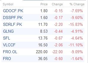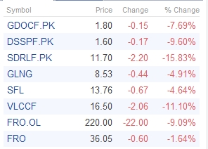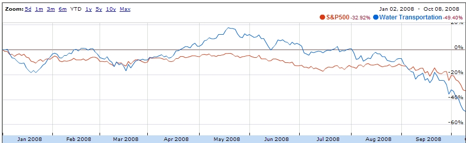 Dagobert2 Oktober 8, 2008 und ewig steigt das Dividendenyield, ganz gesund schaut das teilweise wirklich nicht mehr aus: und hier noch die zugehörigen Aktienkurse aus den USA (da sieht man wie die JF Werte intraday verändern): vor allem Seadrill hat heute erneut kräftig geblutet (im Gegensatz zu vielen anderen Oil Well Services die teilweise im Plus endeten, bzw. wie Halliburton nur geringe Verluste auswiesen), Frontline hatte intraday bereits sein 52W Low unterschritten es aber dann doch noch bei einem kleinen Verlust belassen können. Mal noch ein paar Charts zur jeweiligen Segmententwicklung: Water Transportation vs S&P 500 YTD: Oil Well Service & Equipment vs S&P 500 YTD: Aber wie sagte unsere Nina immer: ALLES WIRD GUT.... Diesen Beitrag teilen Link zum Beitrag