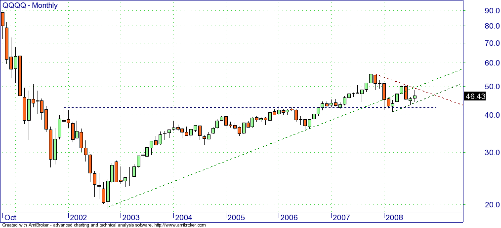 H.B. August 27, 2008 Hi, hier mal ein übergeordnetes Chartbild des investierbaren Nasdaq-ETF (in USD) Der übergeordnete Aufwärtstrend seit 2003 wurde zur Seite verlassen Die erste Korrektur endete (zufällig) an der blau eingezeichneten Unterstützung aus dem Jahr 2002 Nach dem Test der Unterstützung etablierte sich ein frischer Aufwärtsimpuls Die Steigung des Aufwärtsimpulses entspricht der des übergeordneten Aufwärtrtrends Entscheidend ist nun, ob der rot eingezeichnete Widerstand überwunden werden kann. Diesen Beitrag teilen Link zum Beitrag
