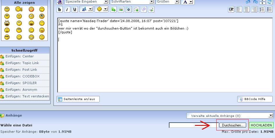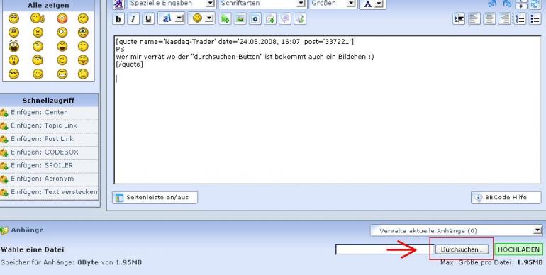 obalaa August 24, 2008 Da bei dem roten pfeil. Datei auswählen, hochladen, beitrag abschicken, fertig. EDIT: Du musst auf den "antwort-Button" klicken, nicht auf "schnellantworten". Jetzt dürfte den Charts ja nix mehr im Wege stehen. Sollen wir dir noch zeigen wie man Orders ausführt^^ Diesen Beitrag teilen Link zum Beitrag