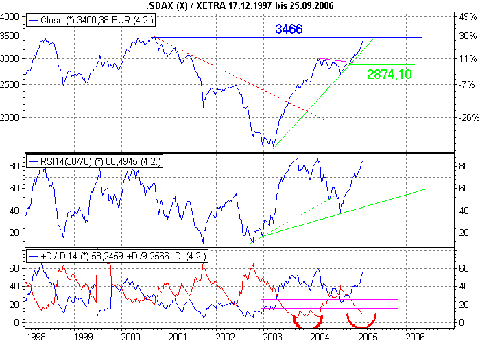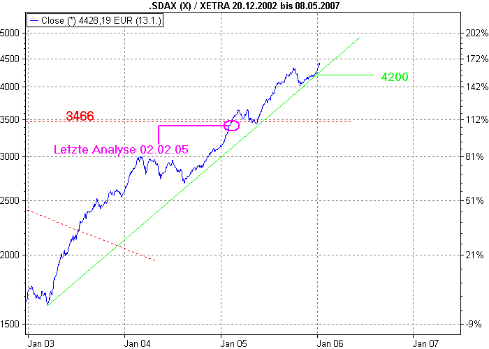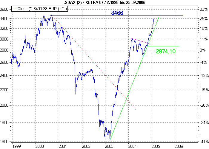 Kurz nach der letzten Analyse (02.02.05) ging der SDAX in einen Seitwärtstrend über und konsolidierte. Die Indikatoren sanken dabei schnell auf ein normales Niveau und die Fahrt ging kurz darauf weiter Richtung Norden.
