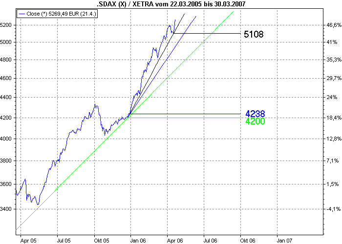 Im weiteren ist noch ein sekundärer Aufwärtstrend (schwarz) etabliert mit horiz. Unterstützung bei 5077 Punkte.