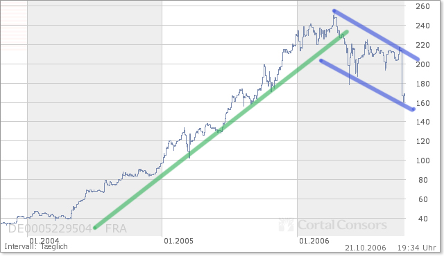 Wer etwas von Charttechnik versteht, der zeichnet nicht nur mal so eine neue flachere Trendlinie in den Chart ein, wenn ein Trend bricht. Damit ein neuer Trend eingezeichnet werden darf, müssen z.B. auch Regeln eingehalten werden. So darf eine horiz. Unterstützung/Widerstand nicht unter.- bzw überschritten werden. Wird die Unterstützung um mehr als 10 % unterschritten gilt dies als Verkaufsignal, wenn auch die Indikatoren neg. Divergenzen aufweisen.