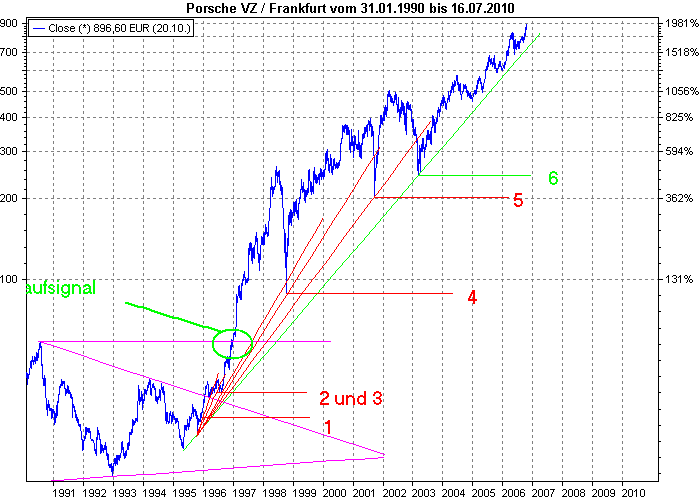 Als Beispiel hier mal die Porsche-Aktie. Bisher wurden zwar die Aufwärtstrendlinien durchbrochen, allerdings wendete die Aktie immer über der horiz. Unterstützung nach oben.